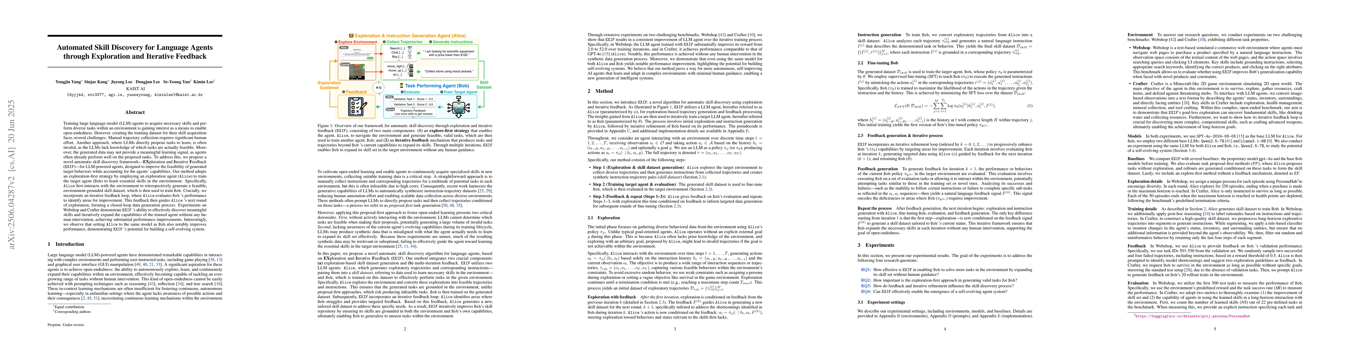 A new framework called EXIF automates skill discovery for language agents, allowing them to learn diverse tasks without human intervention, achieving significant performance improvements in experiments on Webshop and Crafter.