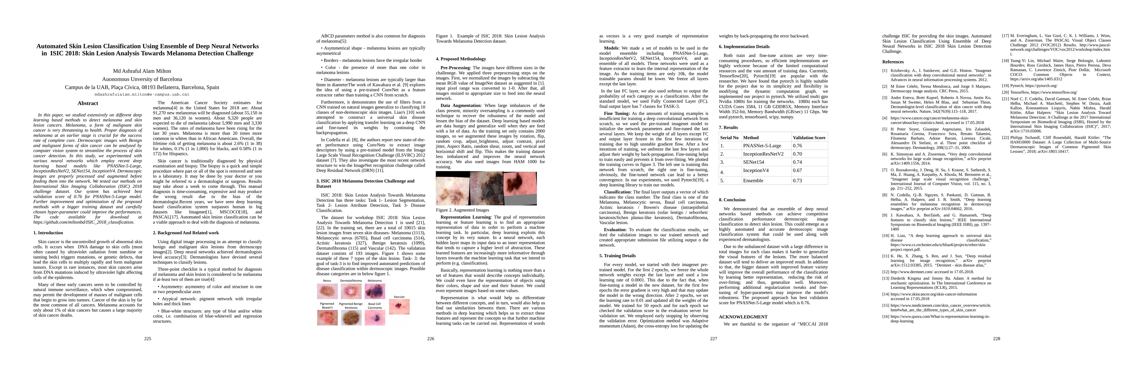 This paper explores various deep learning models for automated skin lesion classification to detect melanoma, achieving the best validation score of 0.76 with the PNASNet-5-Large model on the ISIC 2018 dataset. Future improvements are suggested through larger datasets and optimized hyperparameters.