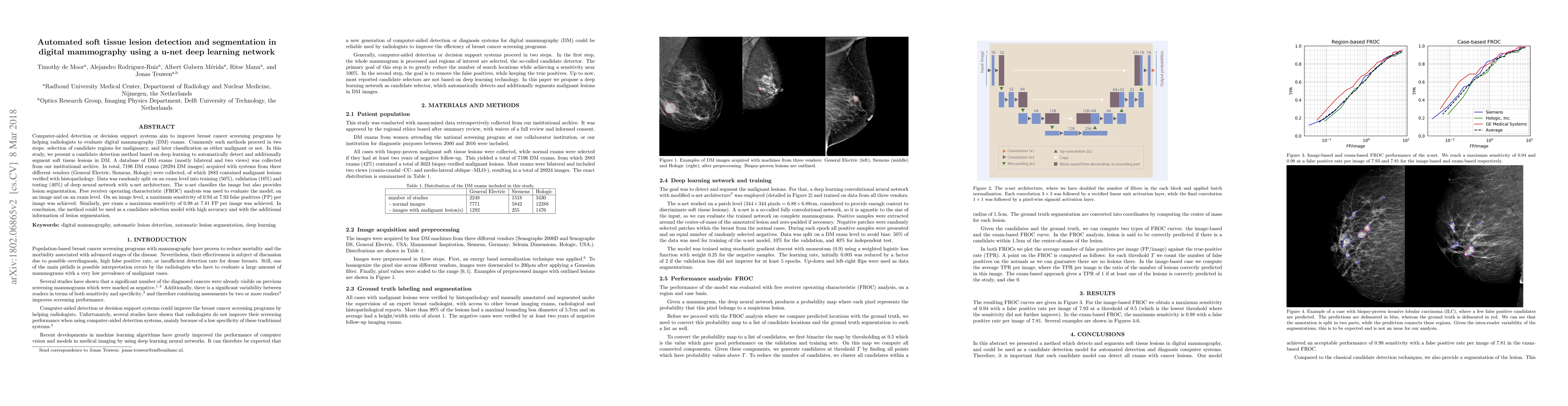 This study introduces a deep learning u-net model for automated detection and segmentation of soft tissue lesions in digital mammography, achieving high sensitivity and low false positives. The model, trained on a large dataset of 7196 exams, shows promising results for potential use in breast cancer screening.