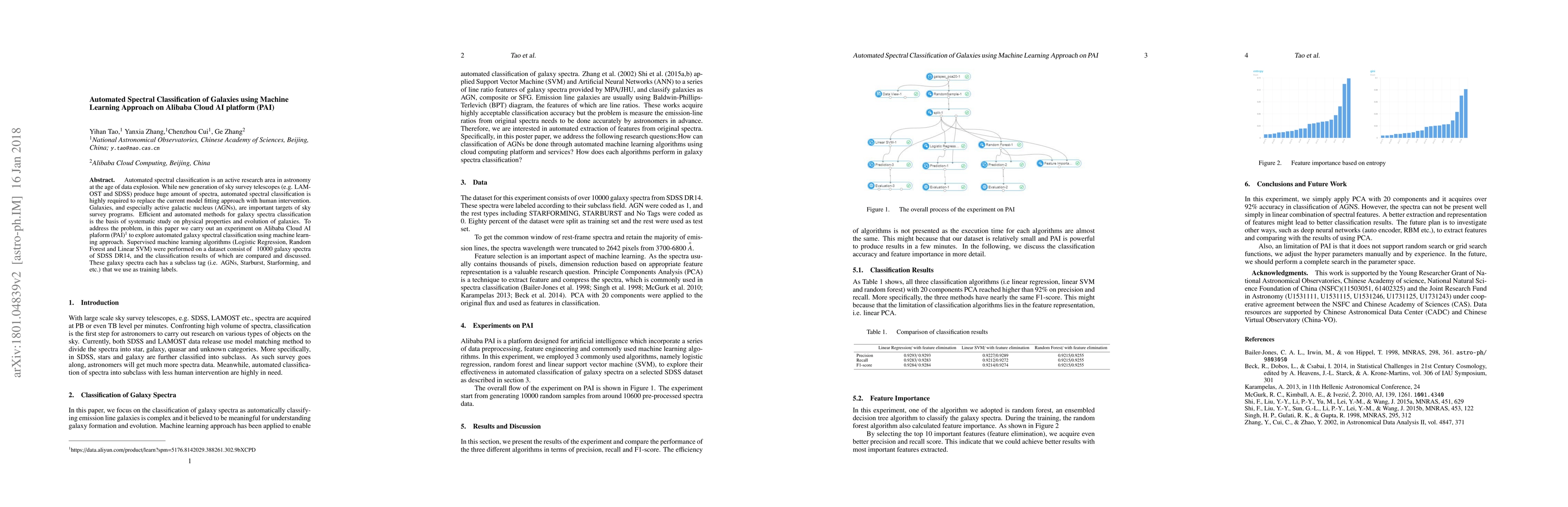 This paper explores the use of machine learning on Alibaba Cloud's AI platform to automate the classification of galaxy spectra from SDSS data, employing supervised algorithms like Logistic Regression, Random Forest, and Linear SVM. The study aims to replace traditional human-driven model fitting with efficient automated methods.