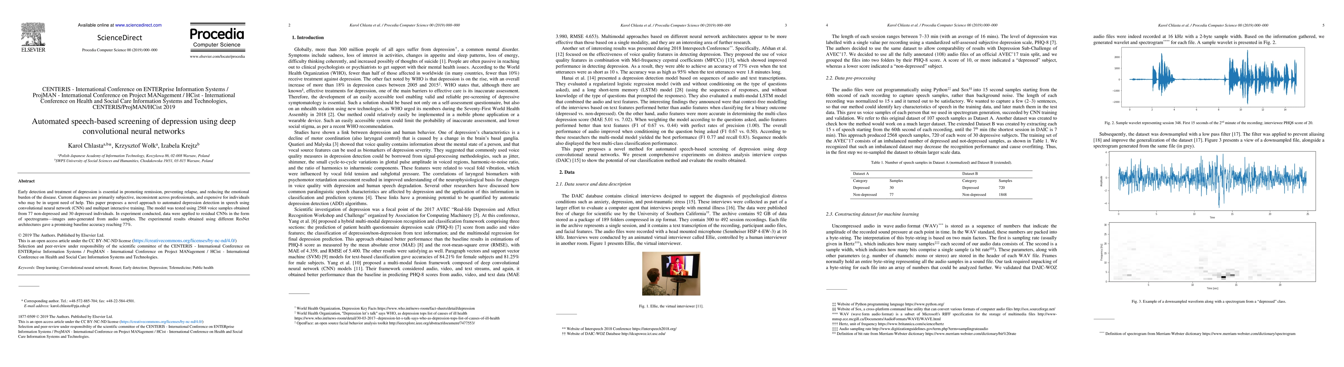 Early detection and treatment of depression is essential in promoting remission, preventing relapse, and reducing the emotional burden of the disease. Current diagnoses are primarily subjective, inconsistent across professionals, and expensive for individuals who may be in urgent need of help. This paper proposes a novel approach to automated depression detection in speech using convolutional neural network (CNN) and multipart interactive training. The model was tested using 2568 voice samples obtained from 77 non-depressed and 30 depressed individuals. In experiment conducted, data were applied to residual CNNs in the form of spectrograms, images auto-generated from audio samples. The experimental results obtained using different ResNet architectures gave a promising baseline accuracy reaching 77%.