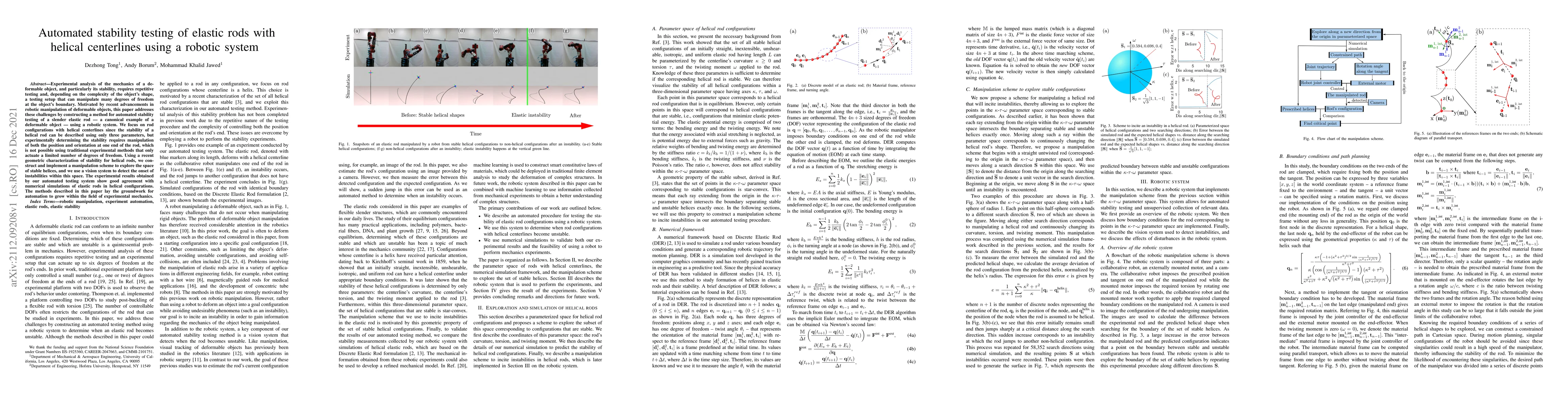 This paper develops an automated robotic system for stability testing of elastic rods with helical centerlines, utilizing a vision system to detect instabilities. The method shows good agreement with numerical simulations, paving the way for broader automation in experimental mechanics.
