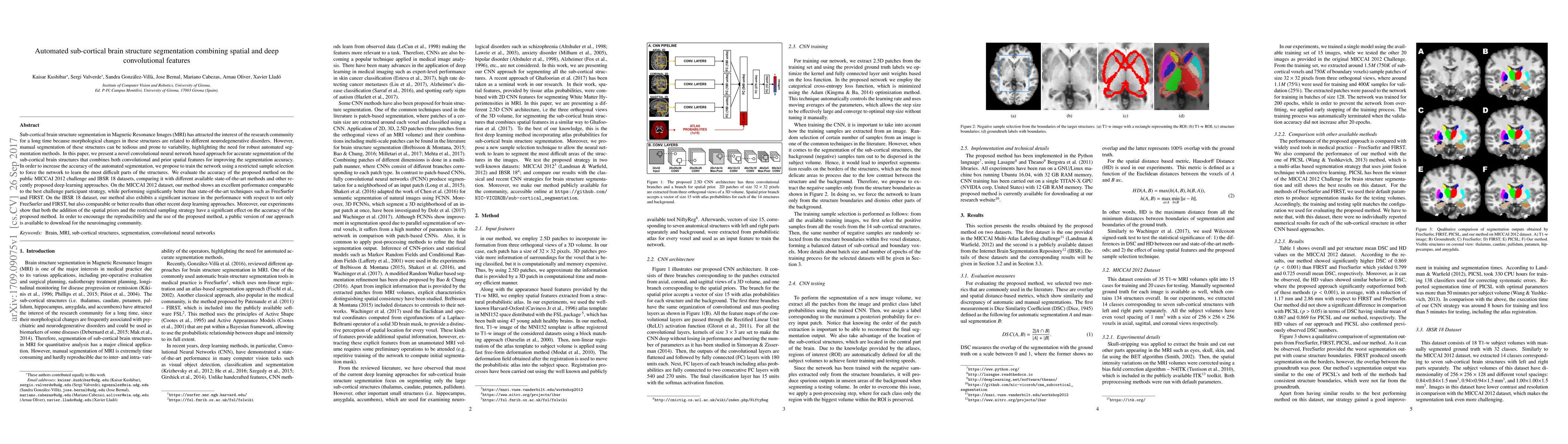 This paper introduces a novel convolutional neural network combining spatial and deep convolutional features for automated segmentation of sub-cortical brain structures in MRIs. The method, evaluated on MICCAI 2012 and IBSR 18 datasets, shows superior performance compared to state-of-the-art techniques and recent deep learning approaches, highlighting the effectiveness of spatial priors and restricted sampling.