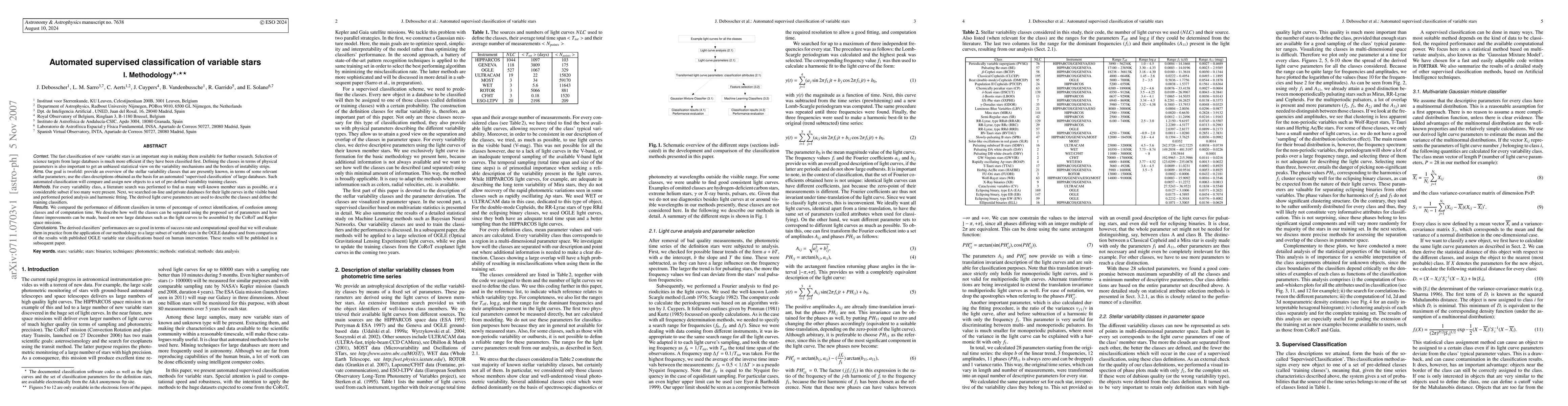 This paper outlines a methodology for automated supervised classification of variable stars using light curve parameters, aiming to efficiently categorize new variable stars and facilitate further research. The study evaluates various classifiers based on accuracy, classification confusion, and computational efficiency, and discusses potential improvements with future large-scale data from missions like CoRoT and Kepler.