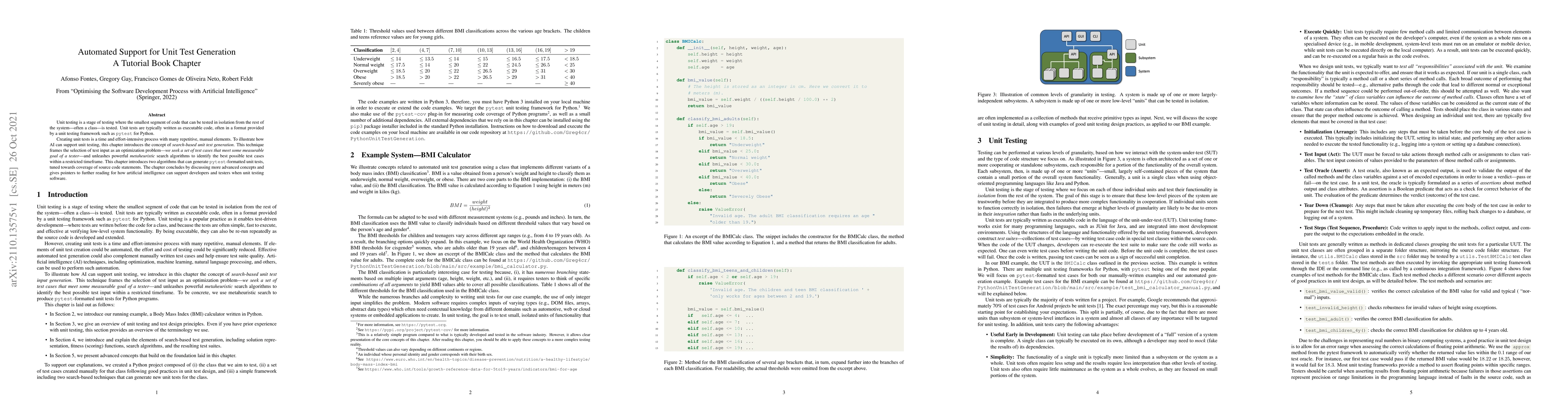 This chapter explores automated support for unit test generation using search-based optimization techniques, introducing two algorithms that generate pytest-formatted unit tests to maximize code coverage. It highlights how AI can streamline the often tedious and time-consuming process of manual unit testing.