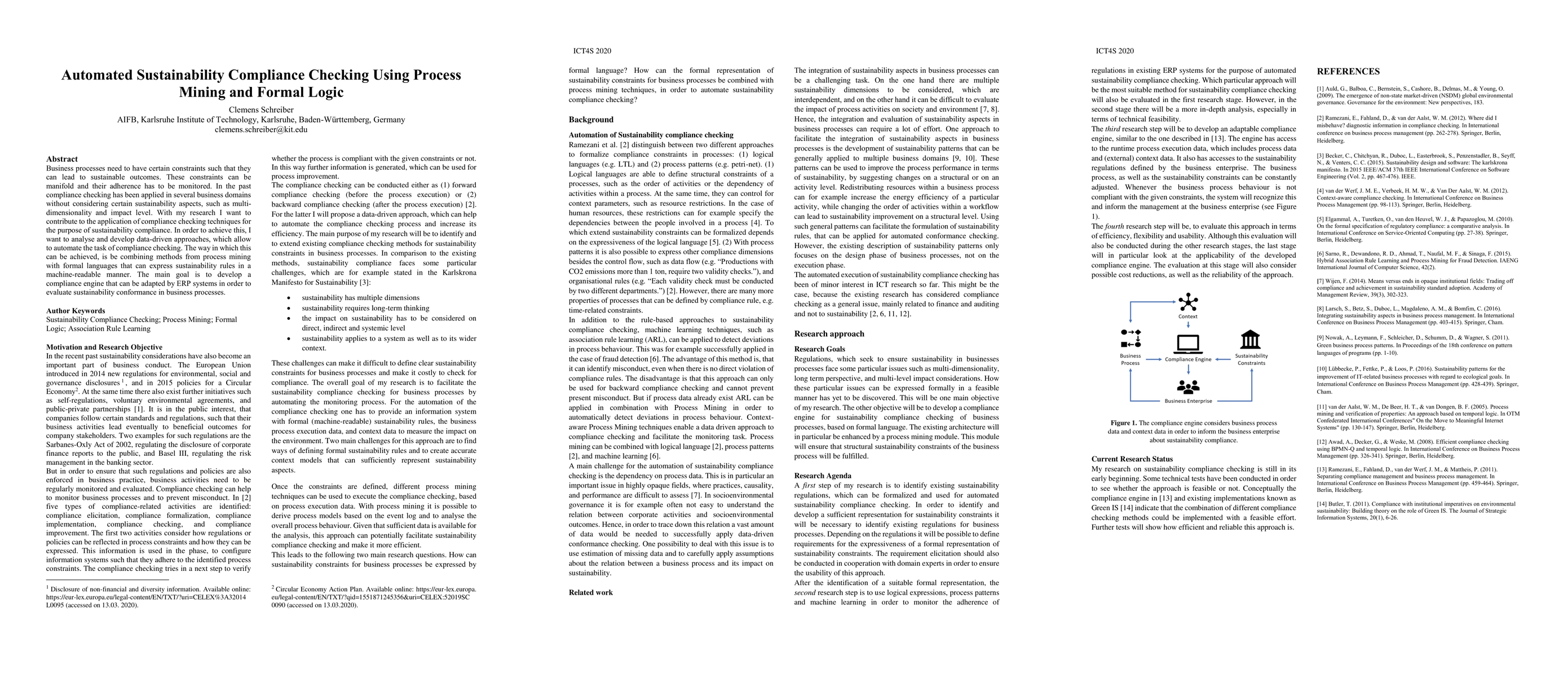 This research develops automated sustainability compliance checking using process mining and formal logic to monitor business processes for adherence to sustainability constraints. The goal is to create a compliance engine adaptable to ERP systems for evaluating sustainability conformance in business operations.