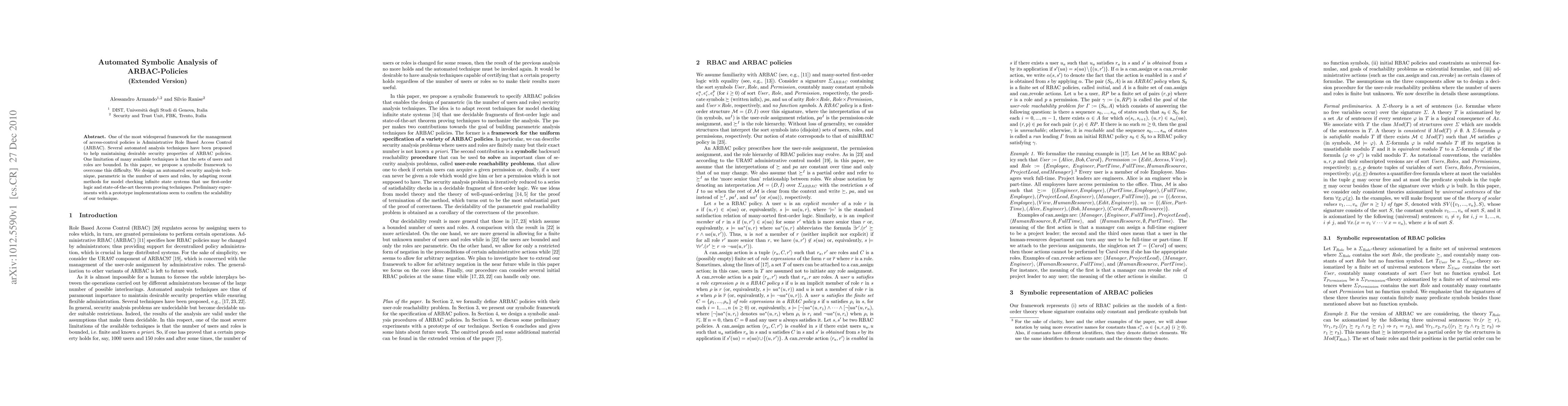 One of the most widespread framework for the management of access-control policies is Administrative Role Based Access Control (ARBAC). Several automated analysis techniques have been proposed to help maintaining desirable security properties of ARBAC policies. One limitation of many available techniques is that the sets of users and roles are bounded. In this paper, we propose a symbolic framework to overcome this difficulty. We design an automated security analysis technique, parametric in the number of users and roles, by adapting recent methods for model checking infinite state systems that use first-order logic and state-of-the-art theorem proving techniques. Preliminary experiments with a prototype implementations seem to confirm the scalability of our technique.