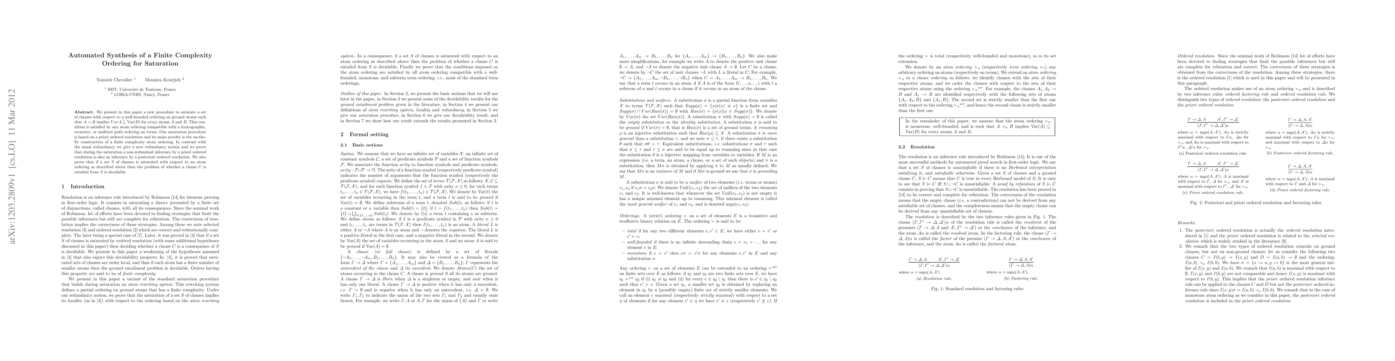 This paper introduces a novel automated synthesis method for constructing a finite complexity ordering to saturate a set of clauses, ensuring that any atom ordering compatible with lexicographic, recursive, or multiset path orderings is maintained. The method employs a priori ordered resolution and proves that non-redundant inferences remain valid under a posteriori resolution, thereby ensuring decidability for entailment problems.