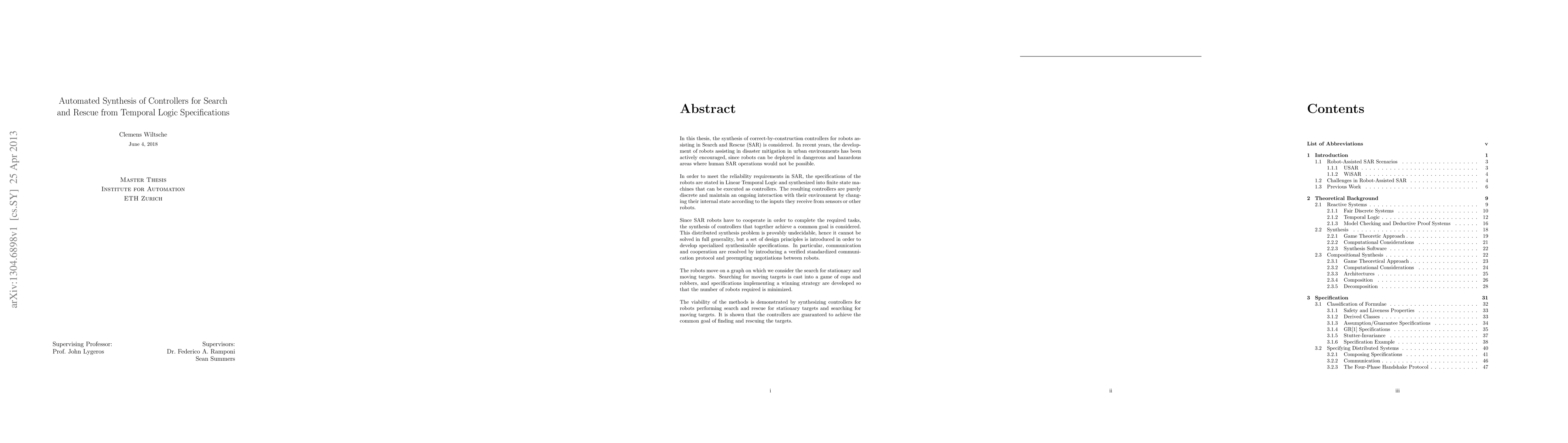 In this thesis, the synthesis of correct-by-construction controllers for robots assisting in Search and Rescue (SAR) is considered. In recent years, the development of robots assisting in disaster mitigation in urban environments has been actively encouraged, since robots can be deployed in dangerous and hazardous areas where human SAR operations would not be possible. In order to meet the reliability requirements in SAR, the specifications of the robots are stated in Linear Temporal Logic and synthesized into finite state machines that can be executed as controllers. The resulting controllers are purely discrete and maintain an ongoing interaction with their environment by changing their internal state according to the inputs they receive from sensors or other robots. Since SAR robots have to cooperate in order to complete the required tasks, the synthesis of controllers that together achieve a common goal is considered. This distributed synthesis problem is provably undecidable, hence it cannot be solved in full generality, but a set of design principles is introduced in order to develop specialized synthesizable specifications. In particular, communication and cooperation are resolved by introducing a verified standardized communication protocol and preempting negotiations between robots. The robots move on a graph on which we consider the search for stationary and moving targets. Searching for moving targets is cast into a game of cops and robbers, and specifications implementing a winning strategy are developed so that the number of robots required is minimized. The viability of the methods is demonstrated by synthesizing controllers for robots performing search and rescue for stationary targets and searching for moving targets. It is shown that the controllers are guaranteed to achieve the common goal of finding and rescuing the targets.