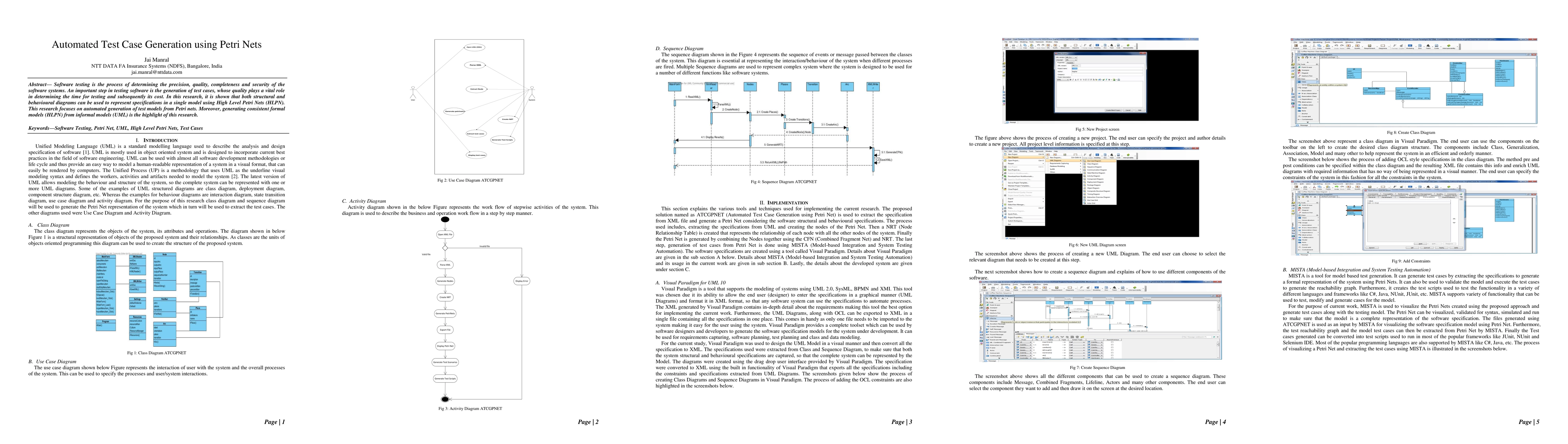 Software testing is the process of determining the precision, quality, completeness and security of the software systems. An important step in testing software is the generation of test cases, whose quality plays a vital role in determining the time for testing and subsequently its cost. In this research, it is shown that both structural and behavioural diagrams can be used to represent specifications in a single model using High Level Petri Nets (HLPN). This research focuses on automated generation of test models from Petri nets. Moreover, generating consistent formal models (HLPN) from informal models (UML) is the highlight of this research.
