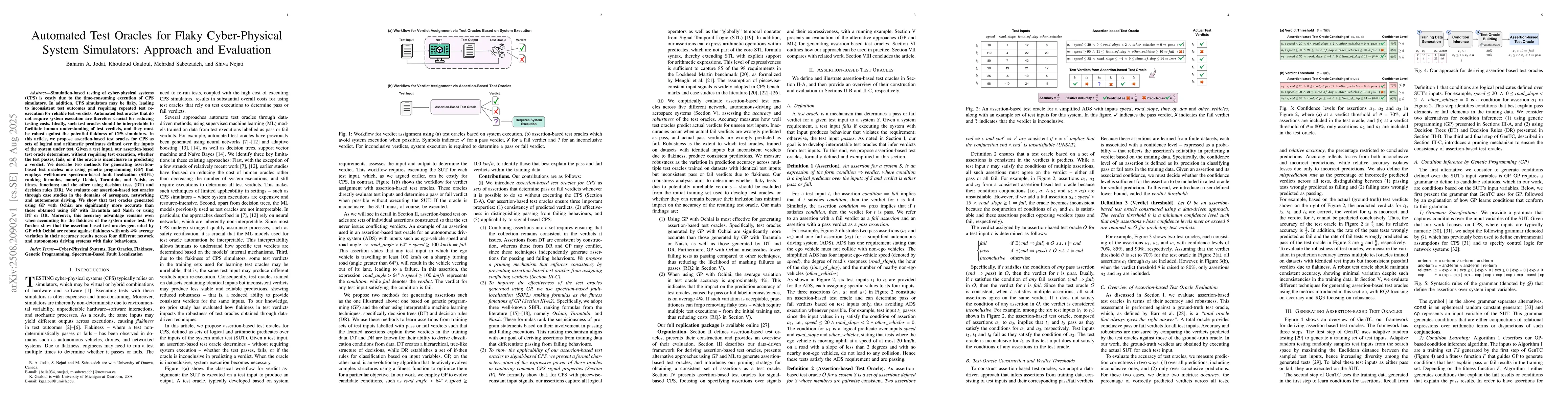 Simulation-based testing of cyber-physical systems (CPS) is costly due to the time-consuming execution of CPS simulators. In addition, CPS simulators may be flaky, leading to inconsistent test outcomes and requiring repeated test re-execution for reliable test verdicts. Automated test oracles that do not require system execution are therefore crucial for reducing testing costs. Ideally, such test oracles should be interpretable to facilitate human understanding of test verdicts, and they must be robust against the potential flakiness of CPS simulators. In this article, we propose assertion-based test oracles for CPS as sets of logical and arithmetic predicates defined over the inputs of the system under test. Given a test input, our assertion-based test oracle determines, without requiring test execution, whether the test passes, fails, or if the oracle is inconclusive in predicting a verdict. We describe two methods for generating assertion-based test oracles: one using genetic programming~(GP) that employs well-known spectrum-based fault localization (SBFL) ranking formulas, namely Ochiai, Tarantula, and Naish, as fitness functions; and the other using decision trees (DT) and decision rules (DR). We evaluate our assertion-based test oracles through case studies in the domains of aerospace, networking and autonomous driving. We show that test oracles generated using GP with Ochiai are significantly more accurate than those obtained using GP with Tarantula and Naish or using DT or DR. Moreover, this accuracy advantage remains even when accounting for the flakiness of the system under test. We further show that the assertion-based test oracles generated by GP with Ochiai are robust against flakiness with only 4% average variation in their accuracy results across four different network and autonomous driving systems with flaky behaviours.