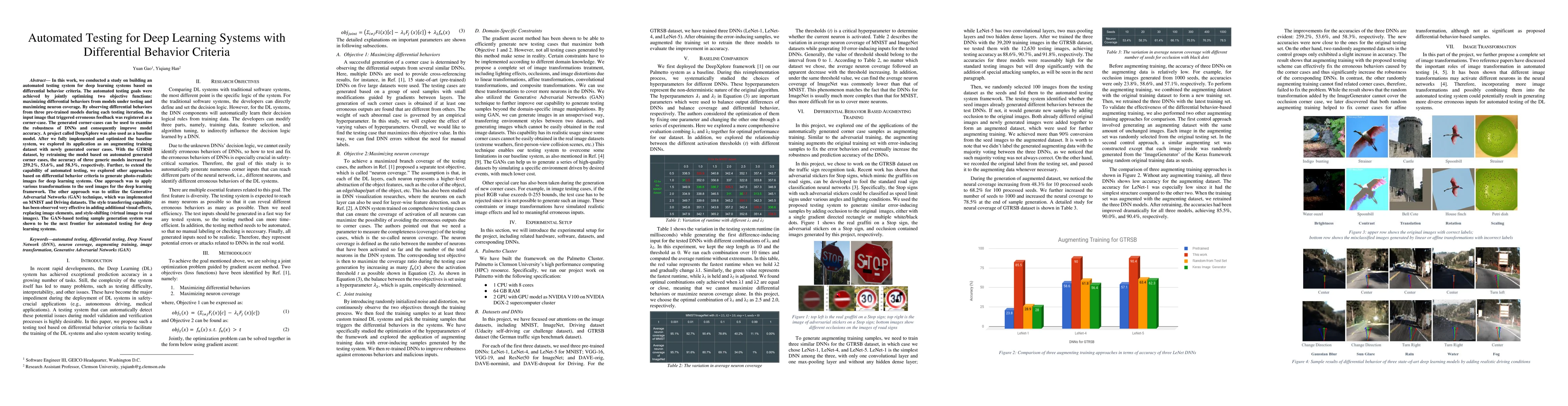 This paper presents an automated testing system for deep learning models based on differential behavior criteria, optimizing neuron coverage and differential behaviors to identify corner cases. The system, DeepXplore, improved model accuracy by 259.2%, 53.6%, and 58.3% across three models, and explored GAN-based techniques for generating photo-realistic testing samples, indicating a promising future for advanced automated testing.