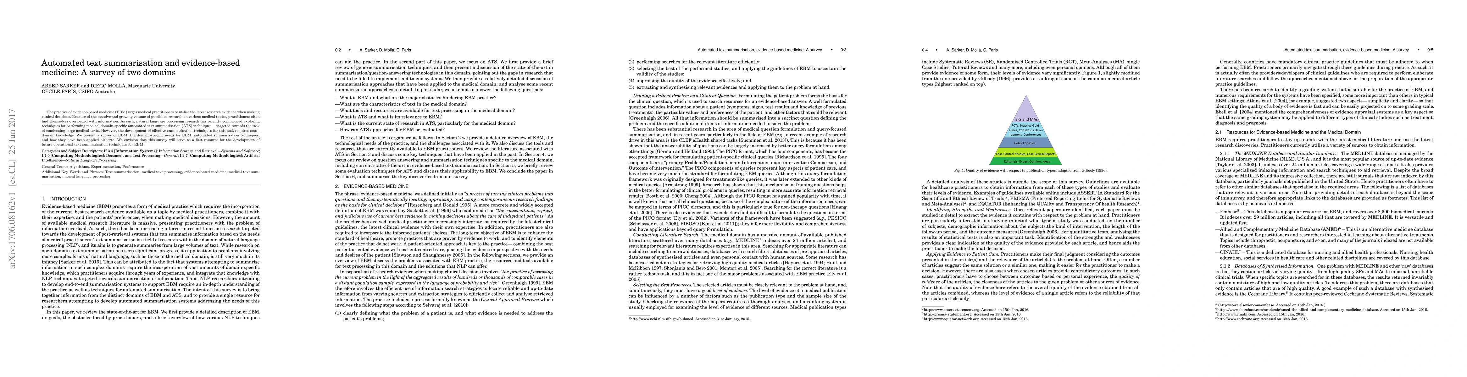 The practice of evidence-based medicine (EBM) urges medical practitioners to utilise the latest research evidence when making clinical decisions. Because of the massive and growing volume of published research on various medical topics, practitioners often find themselves overloaded with information. As such, natural language processing research has recently commenced exploring techniques for performing medical domain-specific automated text summarisation (ATS) techniques-- targeted towards the task of condensing large medical texts. However, the development of effective summarisation techniques for this task requires cross-domain knowledge. We present a survey of EBM, the domain-specific needs for EBM, automated summarisation techniques, and how they have been applied hitherto. We envision that this survey will serve as a first resource for the development of future operational text summarisation techniques for EBM.