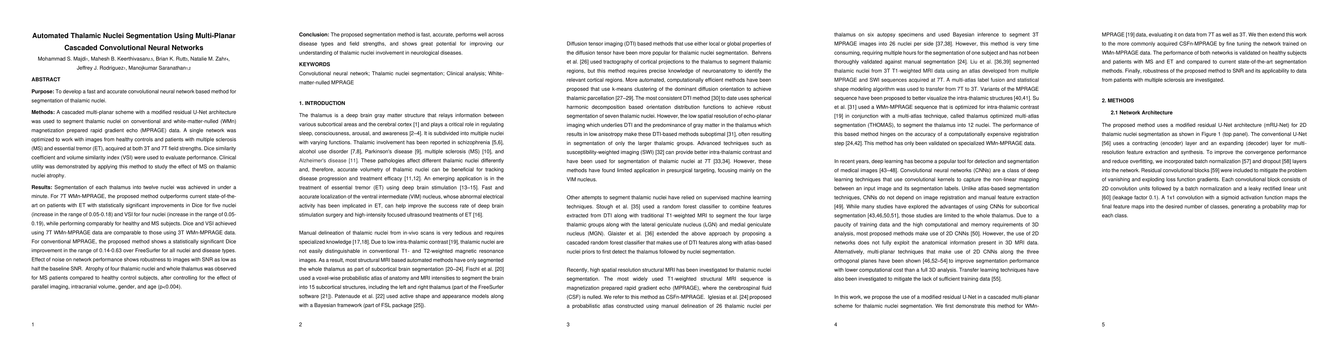 This paper presents a multi-planar cascaded convolutional neural network for segmenting thalamic nuclei in MRI scans, demonstrating improved accuracy over existing methods, especially for patients with essential tremor. The method is robust, fast, and shows potential for enhancing the study of neurological diseases like multiple sclerosis.