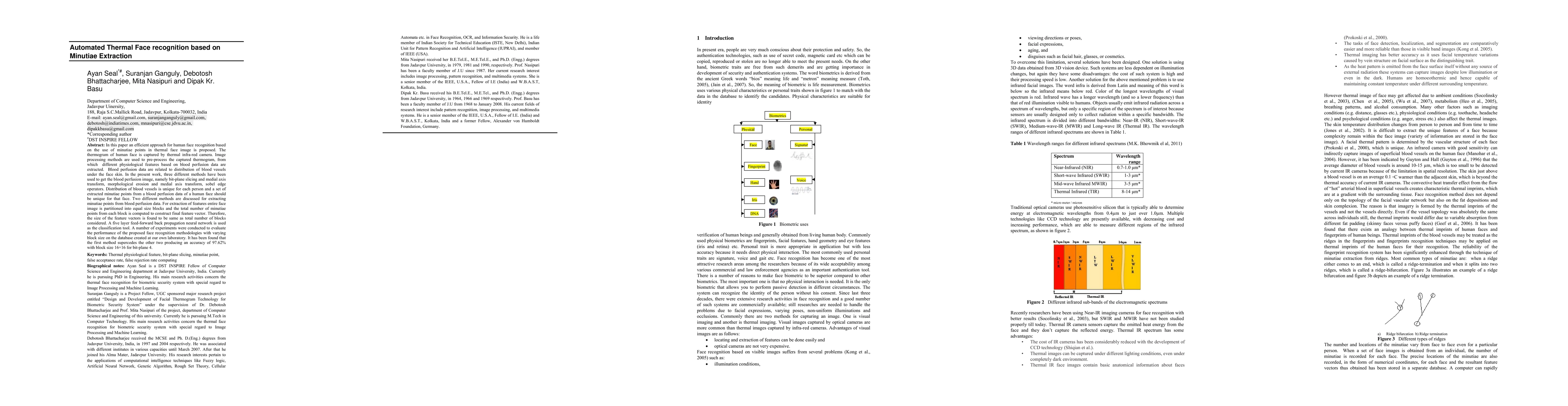 In this paper an efficient approach for human face recognition based on the use of minutiae points in thermal face image is proposed. The thermogram of human face is captured by thermal infra-red camera. Image processing methods are used to pre-process the captured thermogram, from which different physiological features based on blood perfusion data are extracted. Blood perfusion data are related to distribution of blood vessels under the face skin. In the present work, three different methods have been used to get the blood perfusion image, namely bit-plane slicing and medial axis transform, morphological erosion and medial axis transform, sobel edge operators. Distribution of blood vessels is unique for each person and a set of extracted minutiae points from a blood perfusion data of a human face should be unique for that face. Two different methods are discussed for extracting minutiae points from blood perfusion data. For extraction of features entire face image is partitioned into equal size blocks and the total number of minutiae points from each block is computed to construct final feature vector. Therefore, the size of the feature vectors is found to be same as total number of blocks considered. A five layer feed-forward back propagation neural network is used as the classification tool. A number of experiments were conducted to evaluate the performance of the proposed face recognition methodologies with varying block size on the database created at our own laboratory. It has been found that the first method supercedes the other two producing an accuracy of 97.62% with block size 16X16 for bit-plane 4.