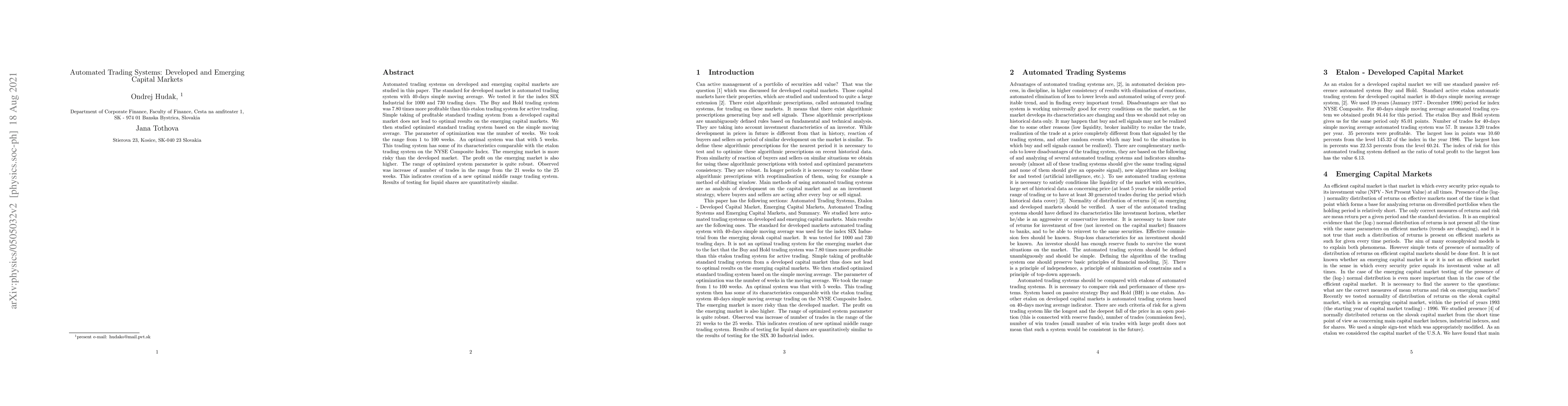 Automated trading systems on developed and emerging capital markets are studied in this paper. The standard for developed market is automated trading system with 40-days simple moving average. We tested it for the index SIX Industrial for 1000 and 730 trading days of the slovak emerging capital market. The Buy and Hold trading system was 7.80 times more profitable than this etalon trading system for active trading. Taking of profitable standard trading system from a developed capital market does not lead to optimal results on the emerging capital markets. We then studied optimized standard trading system based on the simple moving average. The parameter of optimization was the number of weeks. An optimal system was that with 5 weeks. This trading system has some of its characteristics comparable with the etalon trading system on the NYSE Composite Index. The emerging market is more risky than the developed market. The profit on the emerging market is also higher. The range of optimized system parameter is quite robust. Observed was increase of number of trades in the range from the 21 weeks to the 25 weeks. This indicates creation of a new optimal middle range trading system. Results of testing for liquid shares are quantitatively similar.