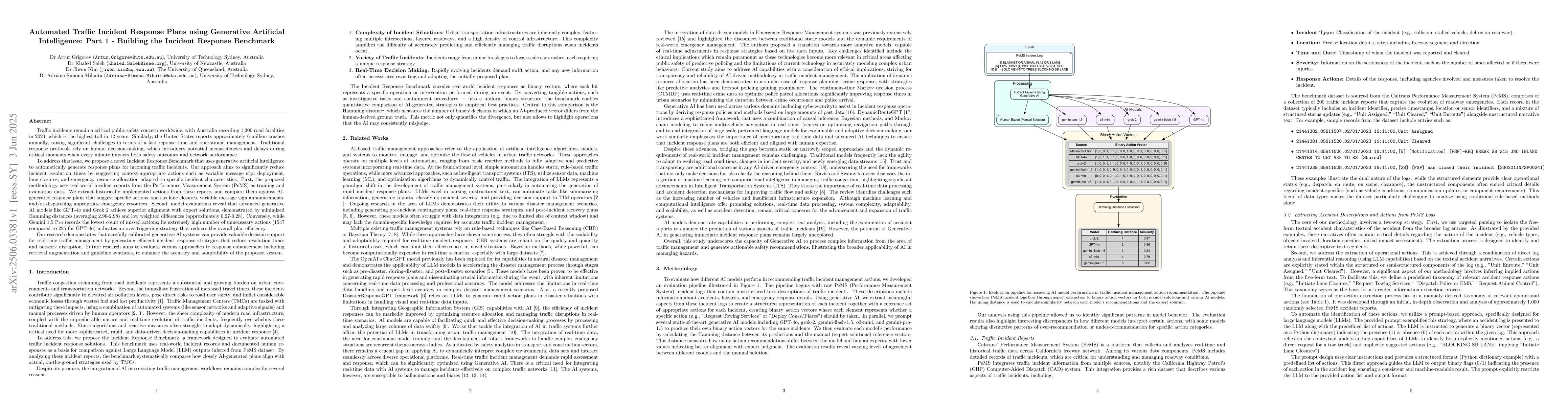 Traffic incidents remain a critical public safety concern worldwide, with Australia recording 1,300 road fatalities in 2024, which is the highest toll in 12 years. Similarly, the United States reports approximately 6 million crashes annually, raising significant challenges in terms of a fast reponse time and operational management. Traditional response protocols rely on human decision-making, which introduces potential inconsistencies and delays during critical moments when every minute impacts both safety outcomes and network performance. To address this issue, we propose a novel Incident Response Benchmark that uses generative artificial intelligence to automatically generate response plans for incoming traffic incidents. Our approach aims to significantly reduce incident resolution times by suggesting context-appropriate actions such as variable message sign deployment, lane closures, and emergency resource allocation adapted to specific incident characteristics. First, the proposed methodology uses real-world incident reports from the Performance Measurement System (PeMS) as training and evaluation data. We extract historically implemented actions from these reports and compare them against AI-generated response plans that suggest specific actions, such as lane closures, variable message sign announcements, and/or dispatching appropriate emergency resources. Second, model evaluations reveal that advanced generative AI models like GPT-4o and Grok 2 achieve superior alignment with expert solutions, demonstrated by minimized Hamming distances (averaging 2.96-2.98) and low weighted differences (approximately 0.27-0.28). Conversely, while Gemini 1.5 Pro records the lowest count of missed actions, its extremely high number of unnecessary actions (1547 compared to 225 for GPT-4o) indicates an over-triggering strategy that reduces the overall plan efficiency.