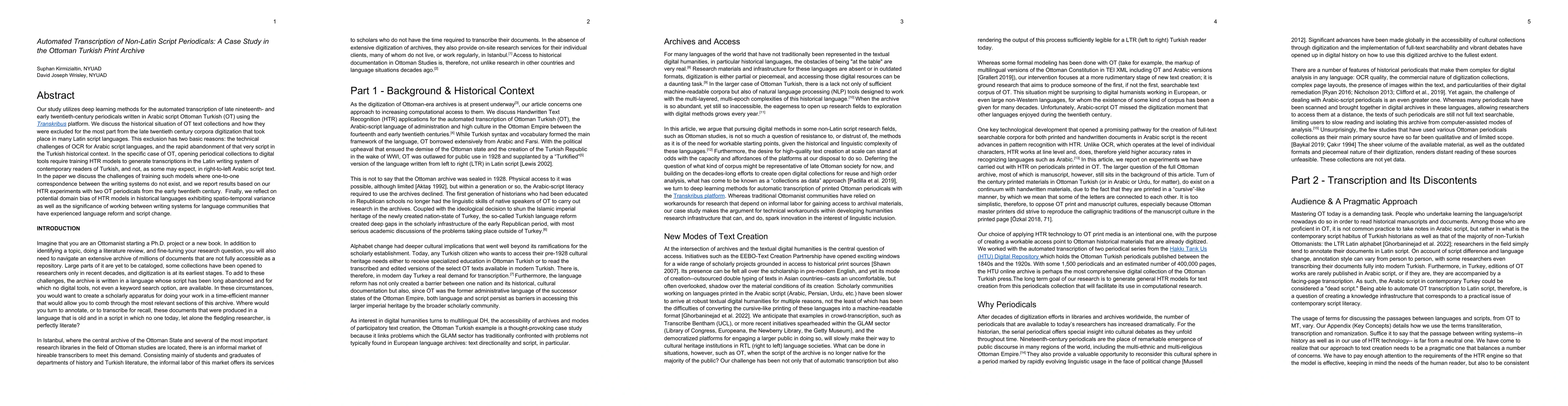Our study utilizes deep learning methods for the automated transcription of late nineteenth- and early twentieth-century periodicals written in Arabic script Ottoman Turkish (OT) using the Transkribus platform. We discuss the historical situation of OT text collections and how they were excluded for the most part from the late twentieth century corpora digitization that took place in many Latin script languages. This exclusion has two basic reasons: the technical challenges of OCR for Arabic script languages, and the rapid abandonment of that very script in the Turkish historical context. In the specific case of OT, opening periodical collections to digital tools require training HTR models to generate transcriptions in the Latin writing system of contemporary readers of Turkish, and not, as some may expect, in right-to-left Arabic script text. In the paper we discuss the challenges of training such models where one-to-one correspondence between the writing systems do not exist, and we report results based on our HTR experiments with two OT periodicals from the early twentieth century. Finally, we reflect on potential domain bias of HTR models in historical languages exhibiting spatio-temporal variance as well as the significance of working between writing systems for language communities that have experienced language reform and script change.