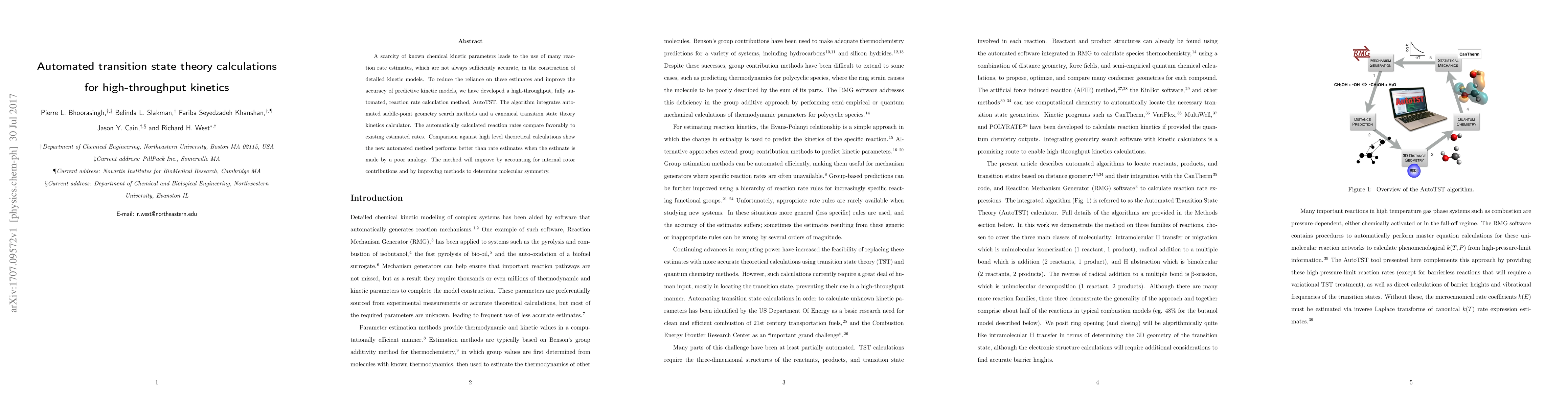 Title: Automated transition state theory calculations for high-throughput kinetics Summary: AutoTST, a new automated method, integrates saddle-point geometry search and transition state theory to calculate reaction rates, outperforming existing estimates, especially when analogies are poor. The method promises to improve further by incorporating internal rotor contributions and better symmetry determination.