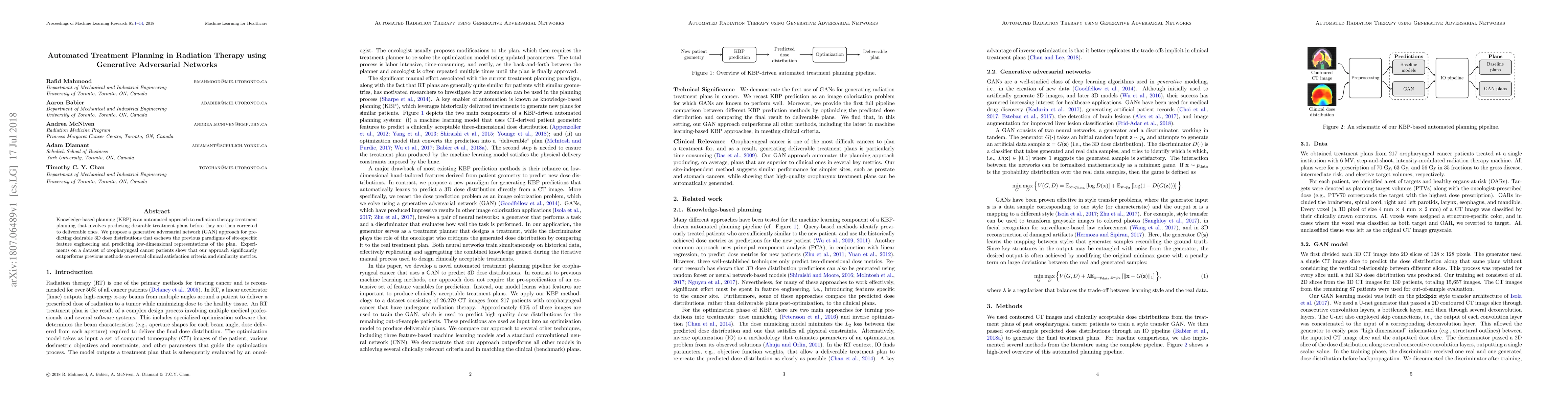 This paper proposes a generative adversarial network (GAN) for automated treatment planning in radiation therapy, predicting 3D dose distributions without site-specific feature engineering. Experiments demonstrate that the GAN method outperforms previous approaches, achieving better clinical satisfaction and similarity metrics in oropharyngeal cancer cases.