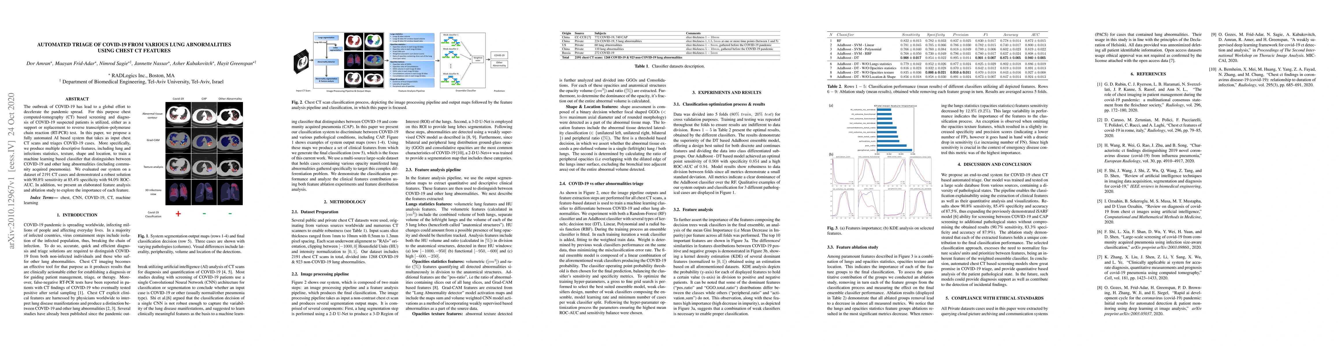 This paper proposes an automated AI system for triaging COVID-19 using chest CT scans, distinguishing it from other lung abnormalities with 90.8% sensitivity and 85.4% specificity. The system analyzes various CT features, including lung statistics and texture, to train a classifier, demonstrating robust performance with a 94.0% ROC-AUC.