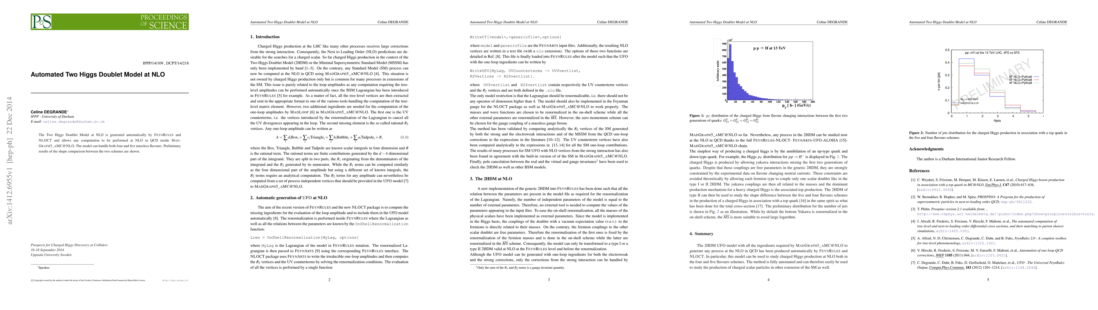The Two Higgs Doublet Model at NLO is generated automatically by FeynRules and NLOCT and allows any computation to be performed at NLO in QCD inside MadGraph5_aMC@NLO. The model can handle both four and five massless flavours. Preliminary results of the shape comparison between the two schemes are shown.
