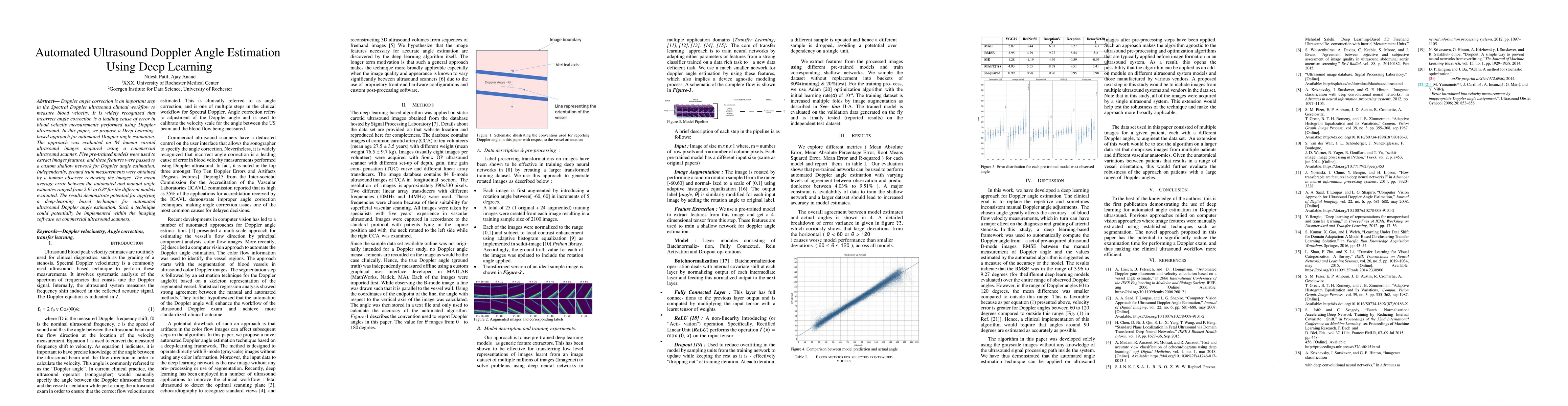 Angle estimation is an important step in the Doppler ultrasound clinical workflow to measure blood velocity. It is widely recognized that incorrect angle estimation is a leading cause of error in Doppler-based blood velocity measurements. In this paper, we propose a deep learning-based approach for automated Doppler angle estimation. The approach was developed using 2100 human carotid ultrasound images including image augmentation. Five pre-trained models were used to extract images features, and these features were passed to a custom shallow network for Doppler angle estimation. Independently, measurements were obtained by a human observer reviewing the images for comparison. The mean absolute error (MAE) between the automated and manual angle estimates ranged from 3.9{\deg} to 9.4{\deg} for the models evaluated. Furthermore, the MAE for the best performing model was less than the acceptable clinical Doppler angle error threshold thus avoiding misclassification of normal velocity values as a stenosis. The results demonstrate potential for applying a deep-learning based technique for automated ultrasound Doppler angle estimation. Such a technique could potentially be implemented within the imaging software on commercial ultrasound scanners.