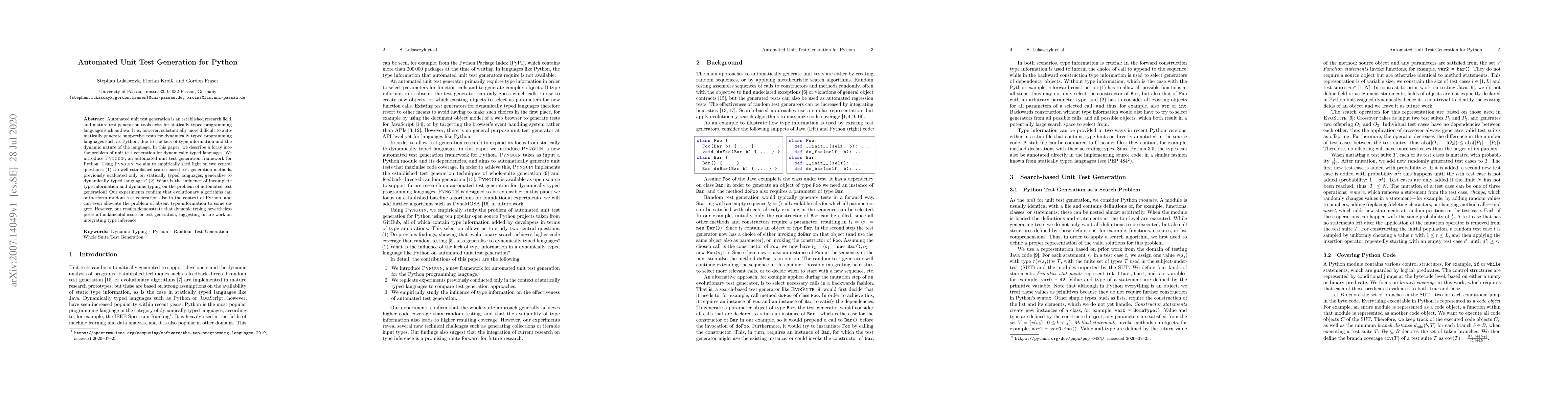 This paper introduces Pynguin, an automated unit test generation framework for Python, aiming to determine if search-based methods from statically typed languages generalize to dynamically typed languages. Results show evolutionary algorithms outperform random tests in Python, but dynamic typing remains a significant challenge.