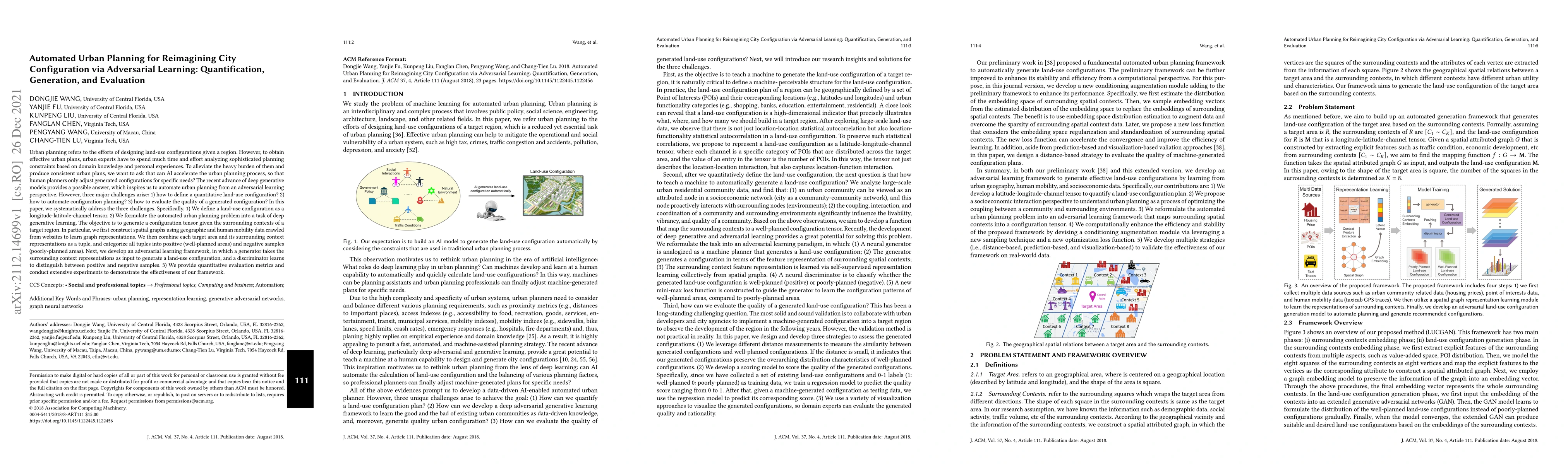 This paper proposes an automated urban planning framework using adversarial learning to generate land-use configurations, addressing challenges in quantification, generation, and evaluation through a tensor-based representation and deep generative models. The effectiveness of the approach is demonstrated through quantitative metrics and experiments.