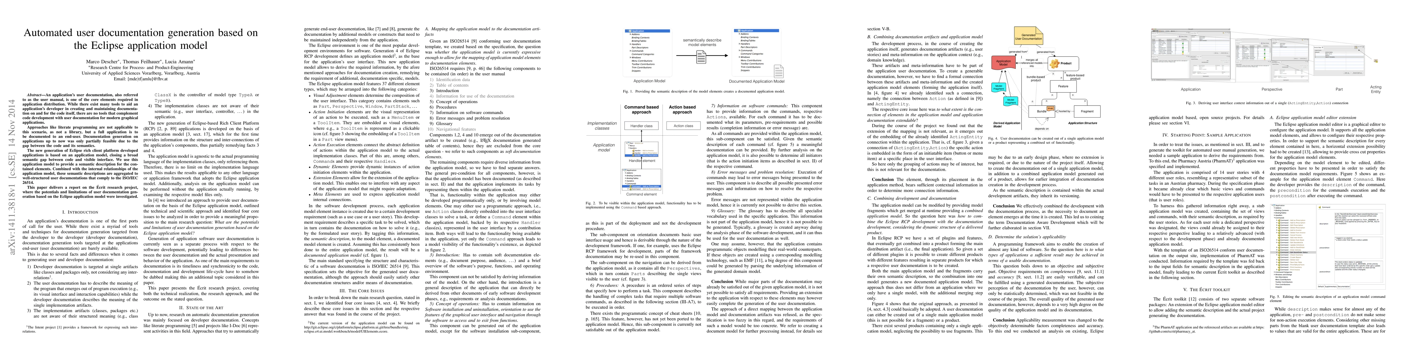 An application's user documentation, also referred to as the user manual, is one of the core elements required in application distribution. While there exist many tools to aid an application's developer in creating and maintaining documentation on and for the code itself, there are no tools that complement code development with user documentation for modern graphical applications. Approaches like literate programming are not applicable to this scenario, as not a library, but a full application is to be documented to an end-user. Documentation generation on applications up to now was only partially feasible due to the gap between the code and its semantics. The new generation of Eclipse rich client platform developed applications is based on an application model, closing a broad semantic gap between code and visible interface. We use this application model to provide a semantic description for the contained elements. Combined with the internal relationships of the application model, these semantic descriptions are aggregated to well-structured user documentations that comply to the ISO/IEC 26514. This paper delivers a report on the Ecrit research project, where the potentials and limitations of user documentation generation based on the Eclipse application model were investigated.