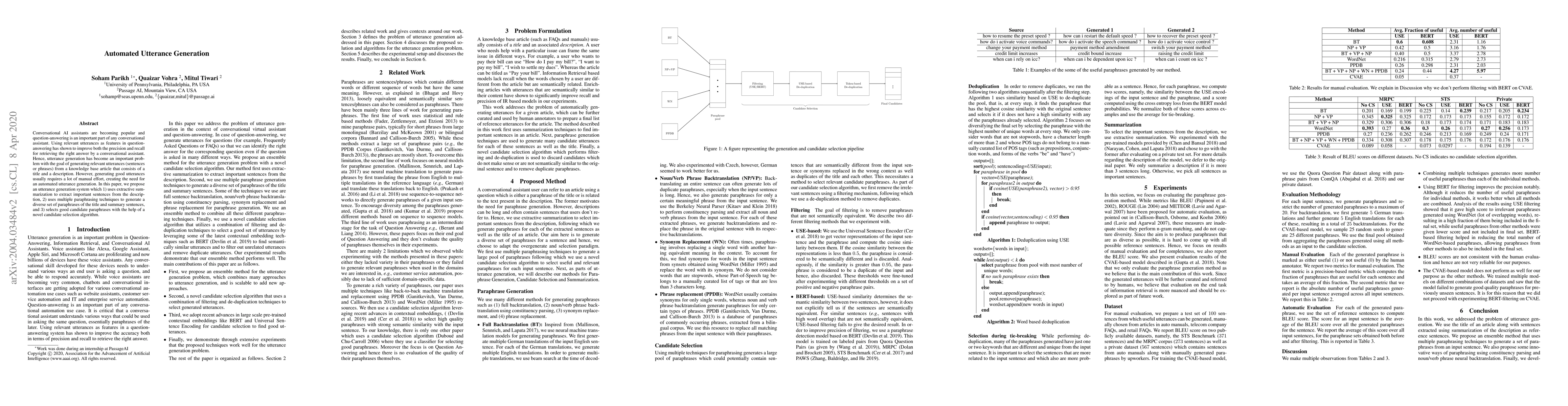 Conversational AI assistants are becoming popular and question-answering is an important part of any conversational assistant. Using relevant utterances as features in question-answering has shown to improve both the precision and recall for retrieving the right answer by a conversational assistant. Hence, utterance generation has become an important problem with the goal of generating relevant utterances (sentences or phrases) from a knowledge base article that consists of a title and a description. However, generating good utterances usually requires a lot of manual effort, creating the need for an automated utterance generation. In this paper, we propose an utterance generation system which 1) uses extractive summarization to extract important sentences from the description, 2) uses multiple paraphrasing techniques to generate a diverse set of paraphrases of the title and summary sentences, and 3) selects good candidate paraphrases with the help of a novel candidate selection algorithm.