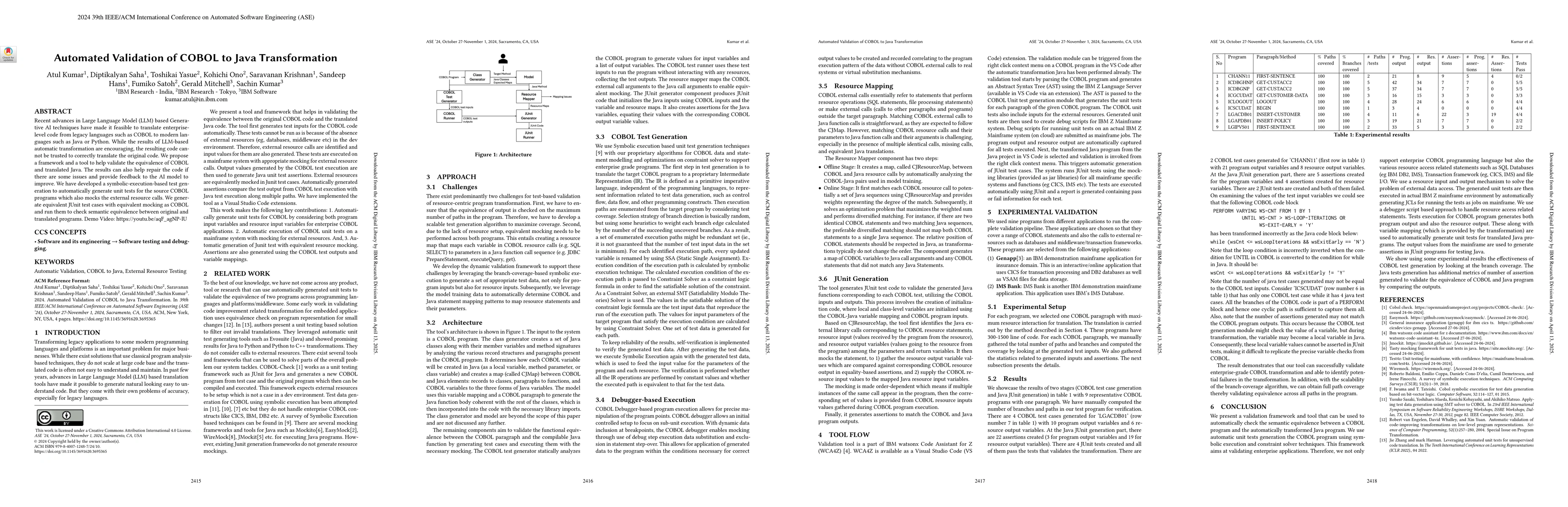 Recent advances in Large Language Model (LLM) based Generative AI techniques have made it feasible to translate enterpriselevel code from legacy languages such as COBOL to modern languages such as Java or Python. While the results of LLM-based automatic transformation are encouraging, the resulting code cannot be trusted to correctly translate the original code. We propose a framework and a tool to help validate the equivalence of COBOL and translated Java. The results can also help repair the code if there are some issues and provide feedback to the AI model to improve. We have developed a symbolic-execution-based test generation to automatically generate unit tests for the source COBOL programs which also mocks the external resource calls. We generate equivalent JUnit test cases with equivalent mocking as COBOL and run them to check semantic equivalence between original and translated programs.