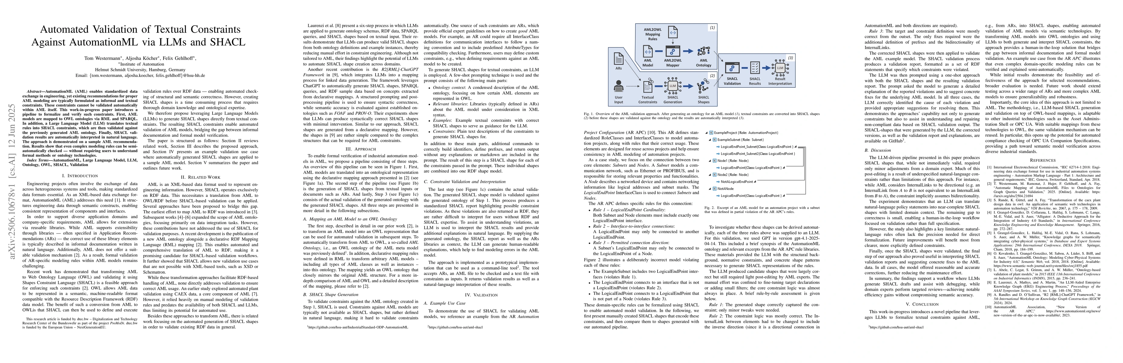 This research paper introduces a pipeline to automate validation of textual constraints in AutomationML (AML) using Large Language Models and SHACL, enabling semi-automated checking of complex modeling rules.