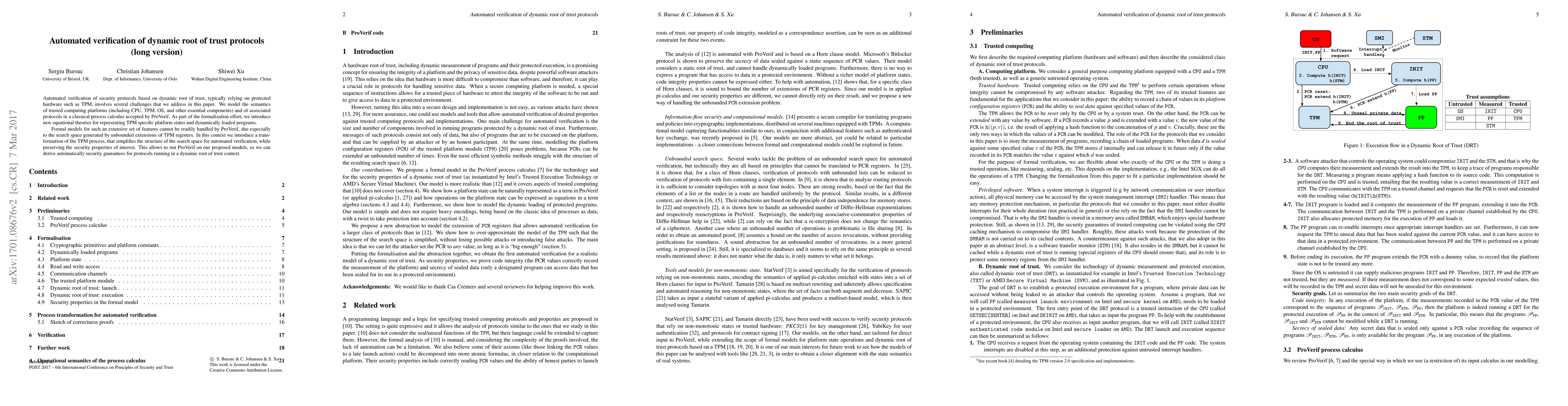 This paper presents an automated verification method for dynamic root of trust security protocols, utilizing TPM-based hardware. It introduces new formal models and transformations to handle complex TPM states and dynamic program loading, enabling ProVerif to derive security guarantees for such protocols.
