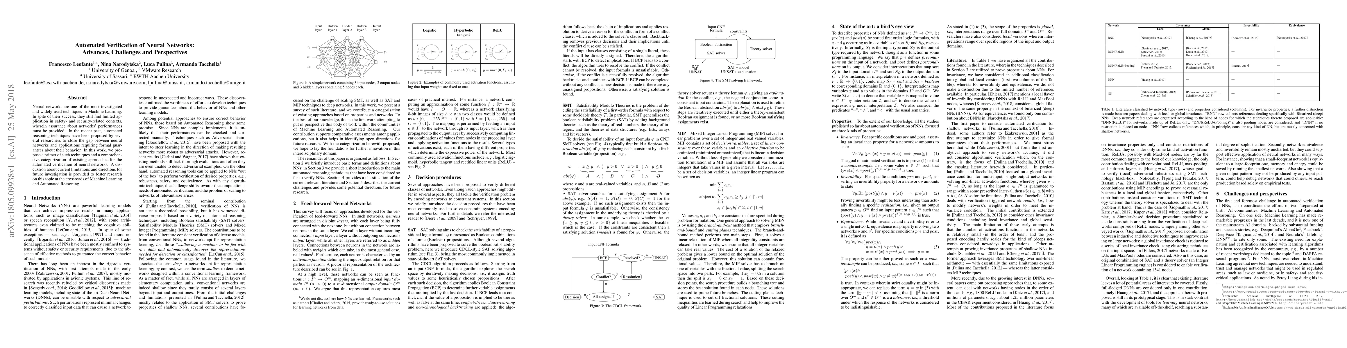Neural networks are one of the most investigated and widely used techniques in Machine Learning. In spite of their success, they still find limited application in safety- and security-related contexts, wherein assurance about networks' performances must be provided. In the recent past, automated reasoning techniques have been proposed by several researchers to close the gap between neural networks and applications requiring formal guarantees about their behavior. In this work, we propose a primer of such techniques and a comprehensive categorization of existing approaches for the automated verification of neural networks. A discussion about current limitations and directions for future investigation is provided to foster research on this topic at the crossroads of Machine Learning and Automated Reasoning.