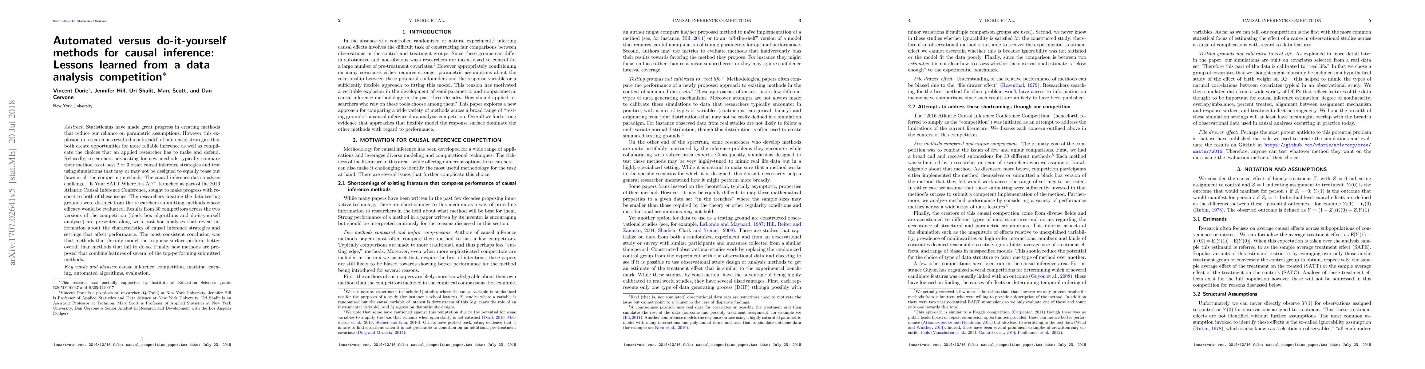 A data analysis competition revealed that flexible modeling of response surfaces improves causal inference performance, while methods relying on parametric assumptions perform worse. New methods combining top-performing approaches were proposed to address current limitations in the field.