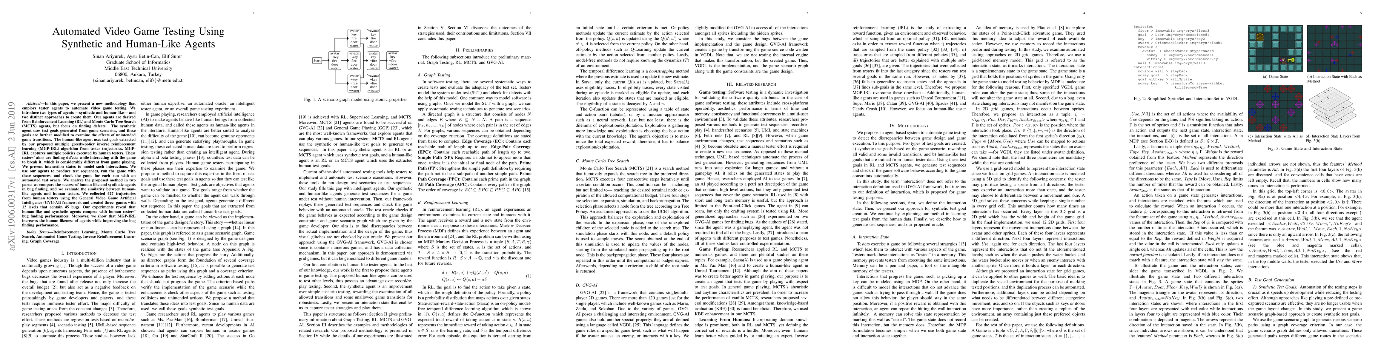 This paper introduces a methodology for automated video game testing using synthetic and human-like agents derived from Reinforcement Learning and Monte Carlo Tree Search. The human-like agents utilize a multiple greedy-policy inverse reinforcement learning algorithm to mimic human testers' defect-finding strategies, demonstrating competitive bug-finding performance against human testers.