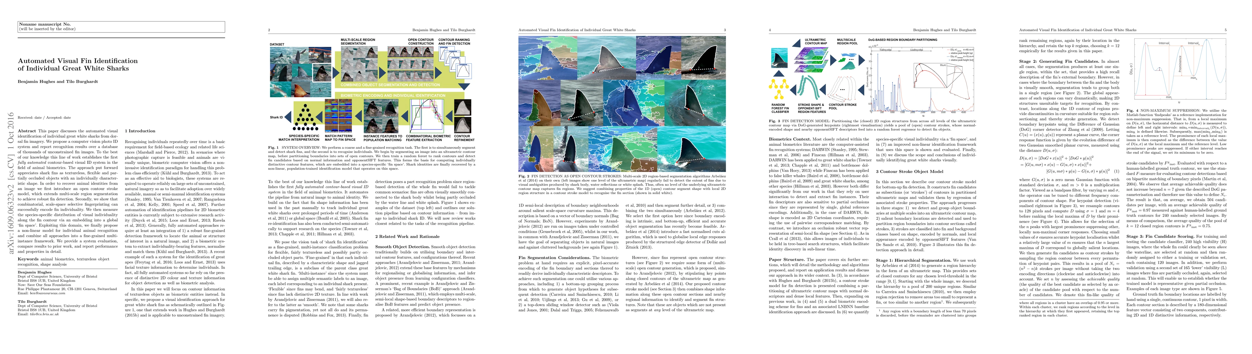 This paper discusses the automated visual identification of individual great white sharks from dorsal fin imagery. We propose a computer vision photo ID system and report recognition results over a database of thousands of unconstrained fin images. To the best of our knowledge this line of work establishes the first fully automated contour-based visual ID system in the field of animal biometrics. The approach put forward appreciates shark fins as textureless, flexible and partially occluded objects with an individually characteristic shape. In order to recover animal identities from an image we first introduce an open contour stroke model, which extends multi-scale region segmentation to achieve robust fin detection. Secondly, we show that combinatorial, scale-space selective fingerprinting can successfully encode fin individuality. We then measure the species-specific distribution of visual individuality along the fin contour via an embedding into a global `fin space'. Exploiting this domain, we finally propose a non-linear model for individual animal recognition and combine all approaches into a fine-grained multi-instance framework. We provide a system evaluation, compare results to prior work, and report performance and properties in detail.