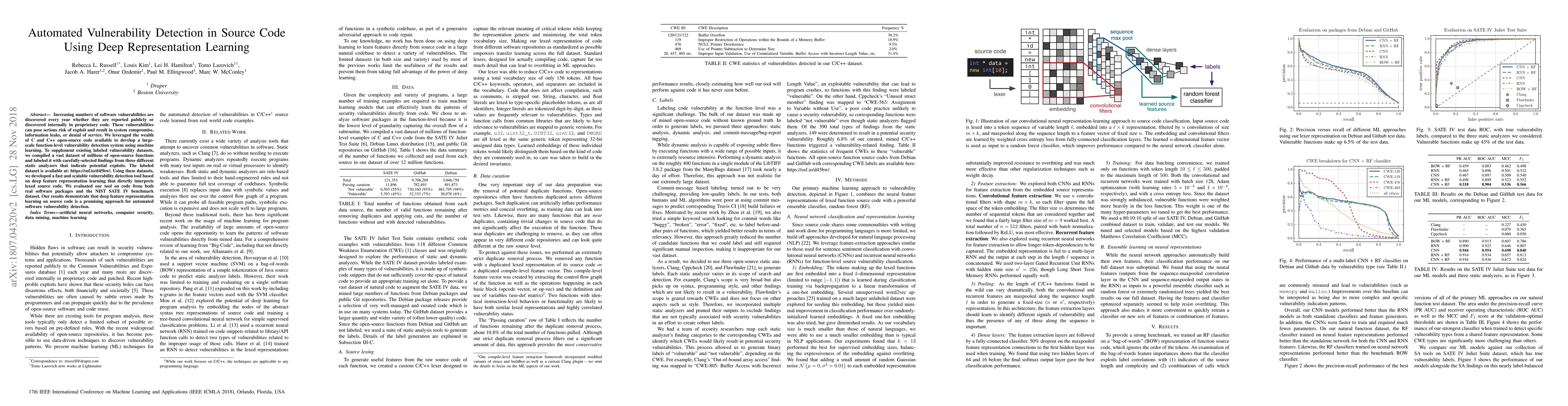 This research develops a large-scale, function-level vulnerability detection system for C and C++ code using deep representation learning. The system is trained on a labeled dataset of millions of open-source functions identified by static analyzers and shows promising results in detecting vulnerabilities in real software packages and a benchmark dataset.