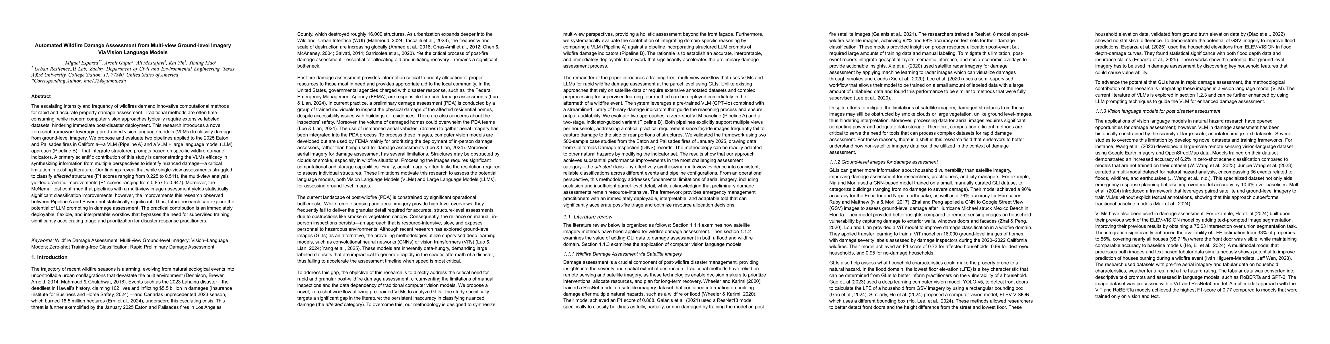 The escalating intensity and frequency of wildfires demand innovative computational methods for rapid and accurate property damage assessment. Traditional methods are often time consuming, while modern computer vision approaches typically require extensive labeled datasets, hindering immediate post-disaster deployment. This research introduces a novel, zero-shot framework leveraging pre-trained vision language models (VLMs) to classify damage from ground-level imagery. We propose and evaluate two pipelines applied to the 2025 Eaton and Palisades fires in California, a VLM (Pipeline A) and a VLM + large language model (LLM) approach (Pipeline B), that integrate structured prompts based on specific wildfire damage indicators. A primary scientific contribution of this study is demonstrating the VLMs efficacy in synthesizing information from multiple perspectives to identify nuanced damage, a critical limitation in existing literature. Our findings reveal that while single view assessments struggled to classify affected structures (F1 scores ranging from 0.225 to 0.511), the multi-view analysis yielded dramatic improvements (F1 scores ranging from 0.857 to 0.947). Moreover, the McNemar test confirmed that pipelines with a multi-view image assessment yields statistically significant classification improvements; however, the improvements this research observed between Pipeline A and B were not statistically significant. Thus, future research can explore the potential of LLM prompting in damage assessment. The practical contribution is an immediately deployable, flexible, and interpretable workflow that bypasses the need for supervised training, significantly accelerating triage and prioritization for disaster response practitioners.