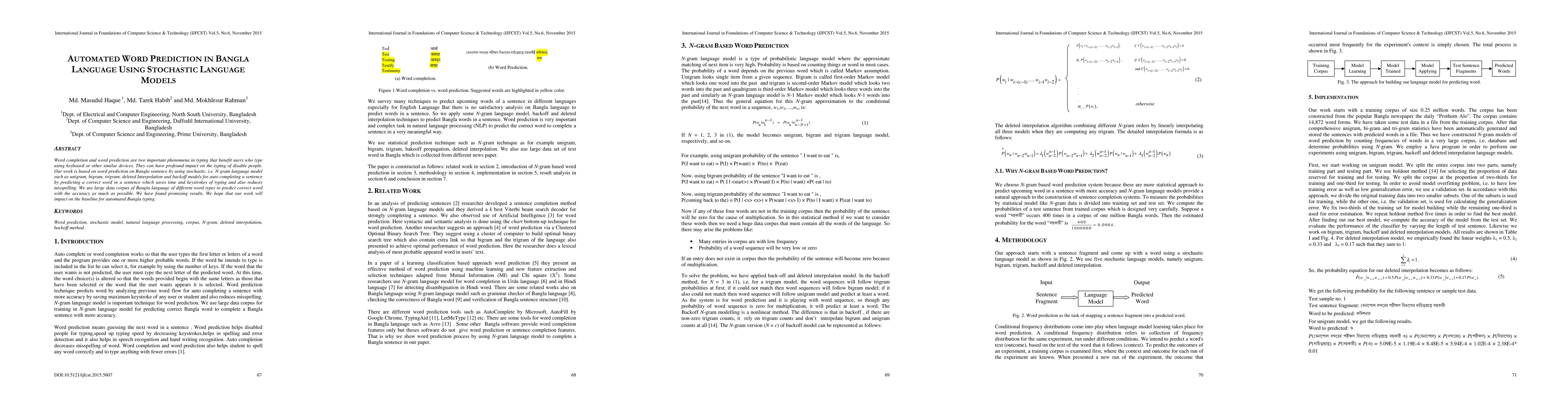 A novel approach to using N-gram models for Bangla language text prediction was developed, which incorporates smoothed corpora data and machine learning algorithms.