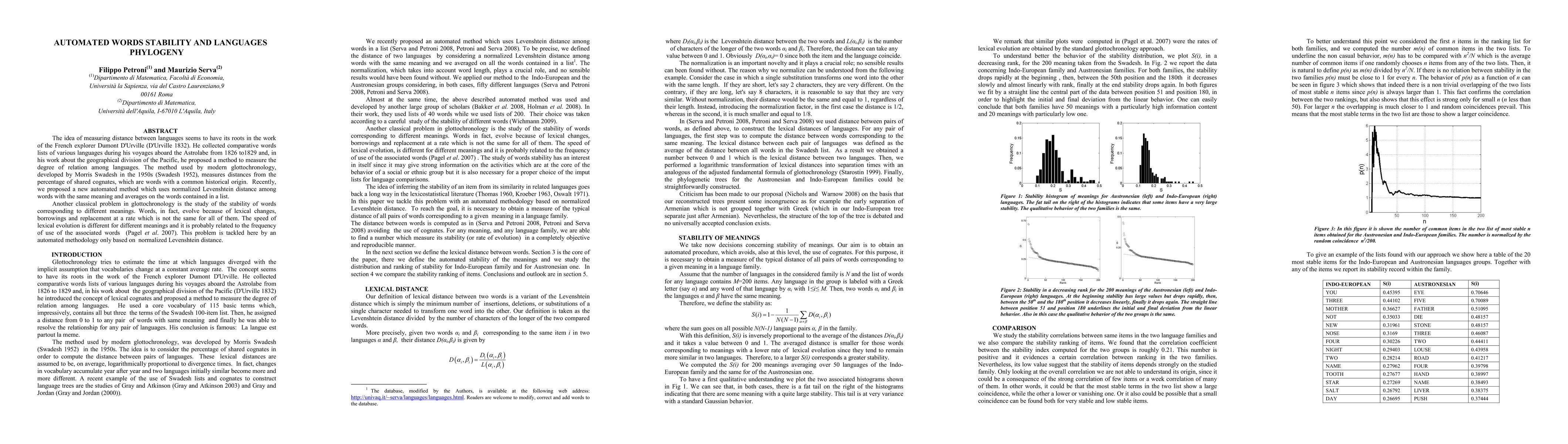 The idea of measuring distance between languages seems to have its roots in the work of the French explorer Dumont D'Urville (D'Urville 1832). He collected comparative words lists of various languages during his voyages aboard the Astrolabe from 1826 to1829 and, in his work about the geographical division of the Pacific, he proposed a method to measure the degree of relation among languages. The method used by modern glottochronology, developed by Morris Swadesh in the 1950s (Swadesh 1952), measures distances from the percentage of shared cognates, which are words with a common historical origin. Recently, we proposed a new automated method which uses normalized Levenshtein distance among words with the same meaning and averages on the words contained in a list. Another classical problem in glottochronology is the study of the stability of words corresponding to different meanings. Words, in fact, evolve because of lexical changes, borrowings and replacement at a rate which is not the same for all of them. The speed of lexical evolution is different for different meanings and it is probably related to the frequency of use of the associated words (Pagel et al. 2007). This problem is tackled here by an automated methodology only based on normalized Levenshtein distance.