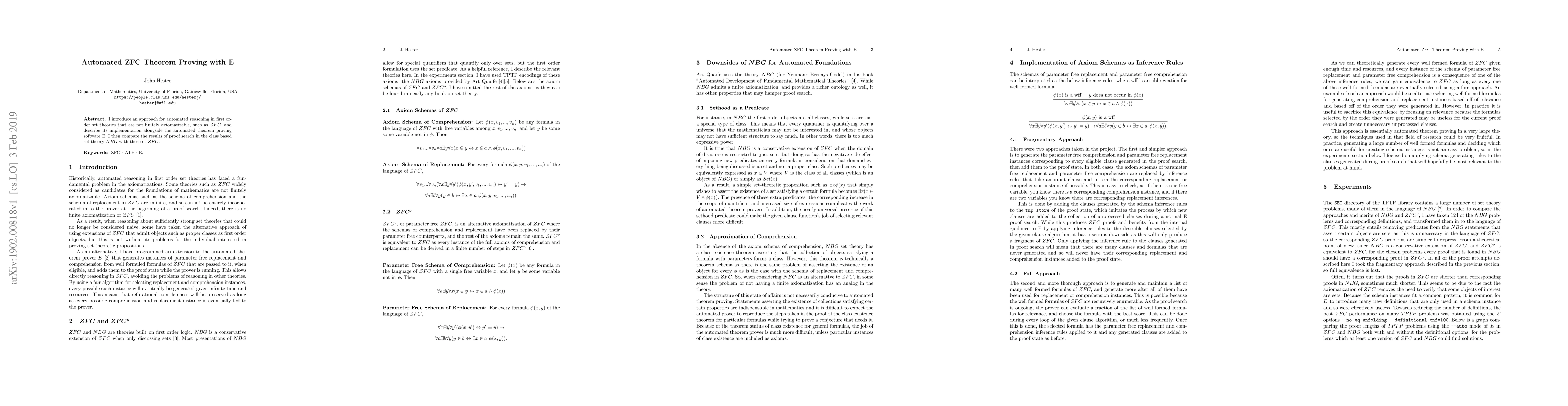 This paper presents an automated reasoning method for proving theorems in non-finitely axiomatizable set theories like $ZFC$ using the theorem prover E. It also compares the effectiveness of this method in $NBG$ versus $ZFC$.