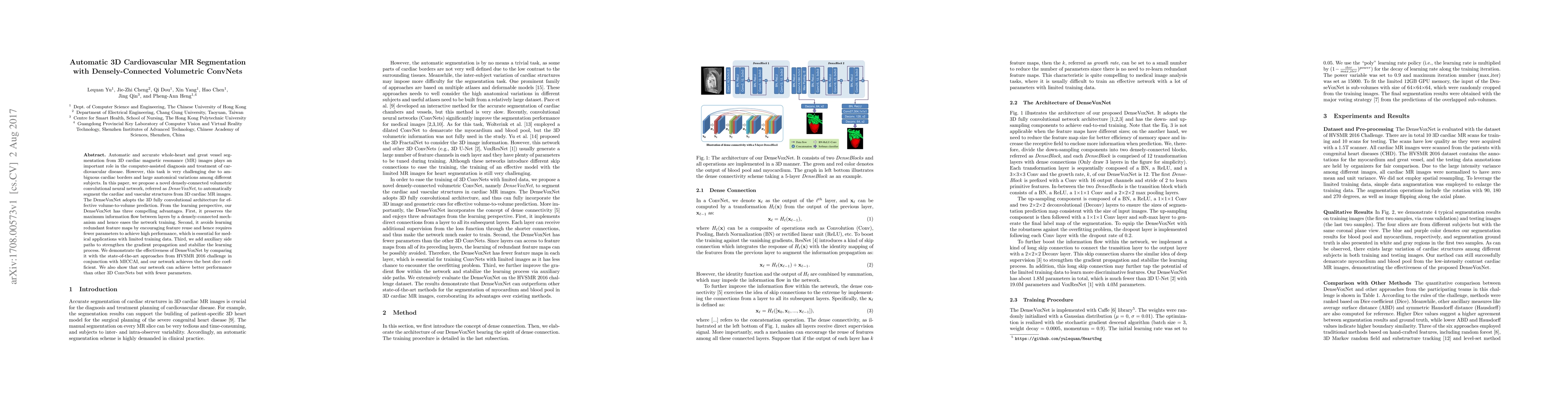 This paper introduces DenseVoxNet, a densely-connected volumetric convolutional neural network, for automatic segmentation of cardiac and vascular structures in 3D cardiac MR images. The network leverages densely-connected layers to maximize information flow, reuse features, and stabilize training, achieving superior performance with fewer parameters compared to state-of-the-art methods.