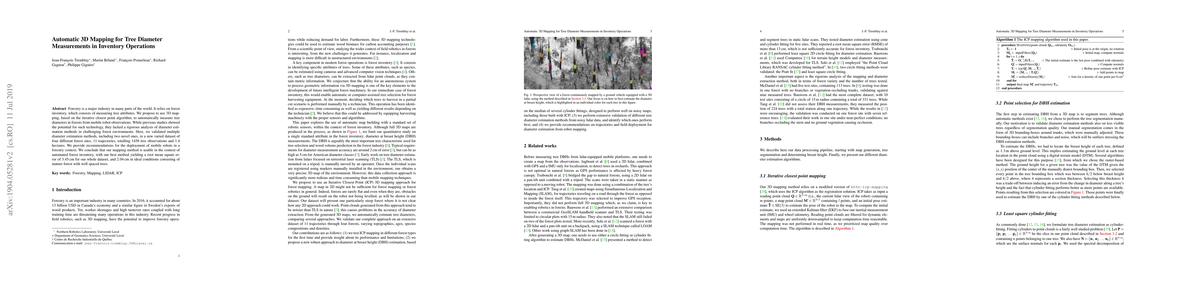 Forestry is a major industry in many parts of the world. It relies on forest inventory, which consists of measuring tree attributes. We propose to use 3D mapping, based on the iterative closest point algorithm, to automatically measure tree diameters in forests from mobile robot observations. While previous studies showed the potential for such technology, they lacked a rigorous analysis of diameter estimation methods in challenging forest environments. Here, we validated multiple diameter estimation methods, including two novel ones, in a new varied dataset of four different forest sites, 11 trajectories, totaling 1458 tree observations and 1.4 hectares. We provide recommendations for the deployment of mobile robots in a forestry context. We conclude that our mapping method is usable in the context of automated forest inventory, with our best method yielding a root mean square error of 3.45 cm for our whole dataset, and 2.04 cm in ideal conditions consisting of mature forest with well spaced trees.