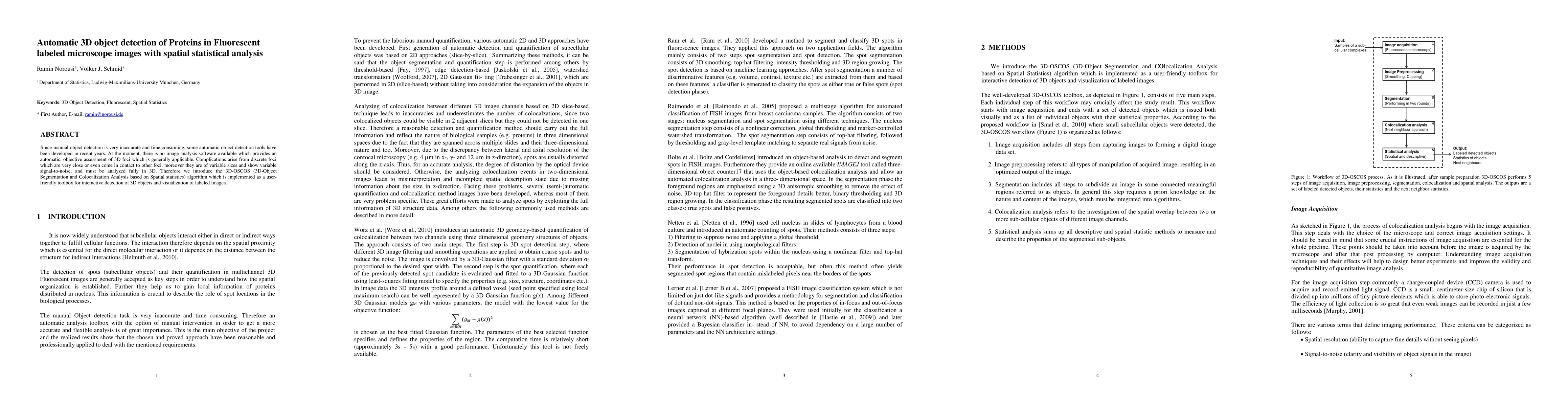 Since manual object detection is very inaccurate and time consuming, some automatic object detection tools have been developed in recent years. At the moment, there is no image analysis software available which provides an automatic, objective assessment of 3D foci which is generally applicable. Complications arise from discrete foci which are very close or even come in contact to other foci, moreover they are of variable sizes and show variable signal-to-noise, and must be analyzed fully in 3D. Therefore we introduce the 3D-OSCOS (3D-Object Segmentation and Colocalization Analysis based on Spatial statistics) algorithm which is implemented as a user-friendly toolbox for interactive detection of 3D objects and visualization of labeled images.