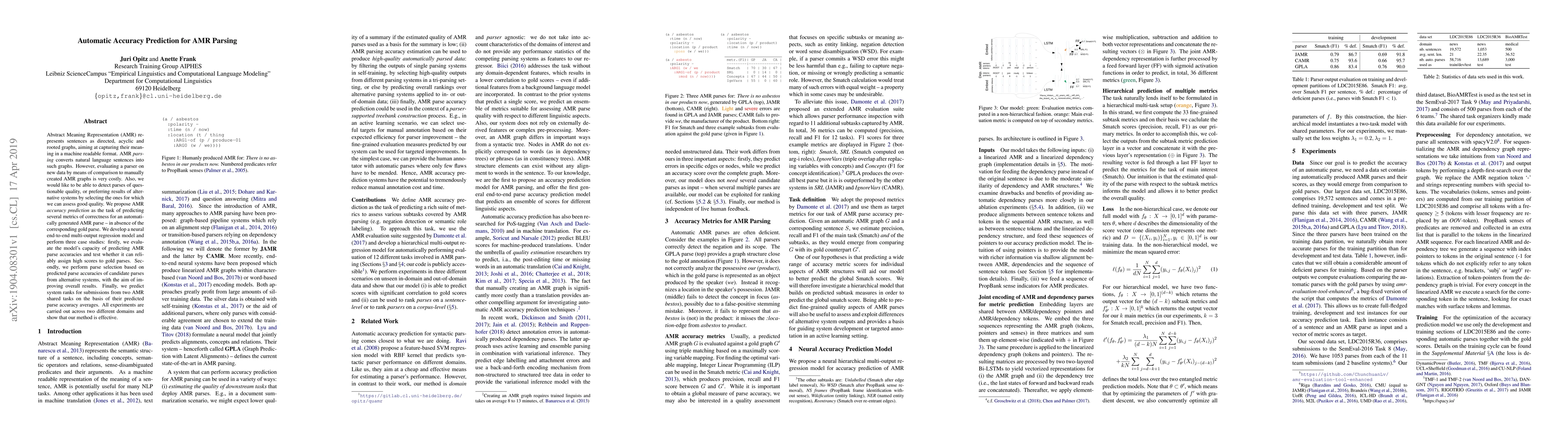 This paper proposes an automatic accuracy prediction method for AMR parsing that predicts correctness metrics for automatically generated AMR graphs without requiring gold standard parses. The authors develop a neural regression model and demonstrate its effectiveness in predicting parse accuracy, improving parse selection from alternative systems, and ranking system submissions in shared tasks across different domains.