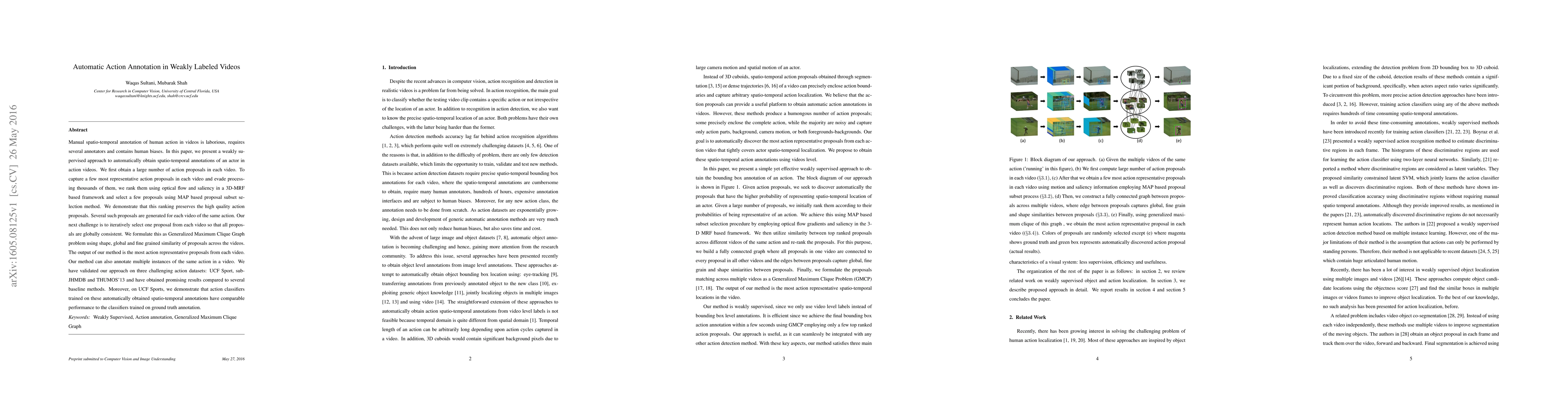 Manual spatio-temporal annotation of human action in videos is laborious, requires several annotators and contains human biases. In this paper, we present a weakly supervised approach to automatically obtain spatio-temporal annotations of an actor in action videos. We first obtain a large number of action proposals in each video. To capture a few most representative action proposals in each video and evade processing thousands of them, we rank them using optical flow and saliency in a 3D-MRF based framework and select a few proposals using MAP based proposal subset selection method. We demonstrate that this ranking preserves the high quality action proposals. Several such proposals are generated for each video of the same action. Our next challenge is to iteratively select one proposal from each video so that all proposals are globally consistent. We formulate this as Generalized Maximum Clique Graph problem using shape, global and fine grained similarity of proposals across the videos. The output of our method is the most action representative proposals from each video. Our method can also annotate multiple instances of the same action in a video. We have validated our approach on three challenging action datasets: UCF Sport, sub-JHMDB and THUMOS'13 and have obtained promising results compared to several baseline methods. Moreover, on UCF Sports, we demonstrate that action classifiers trained on these automatically obtained spatio-temporal annotations have comparable performance to the classifiers trained on ground truth annotation.