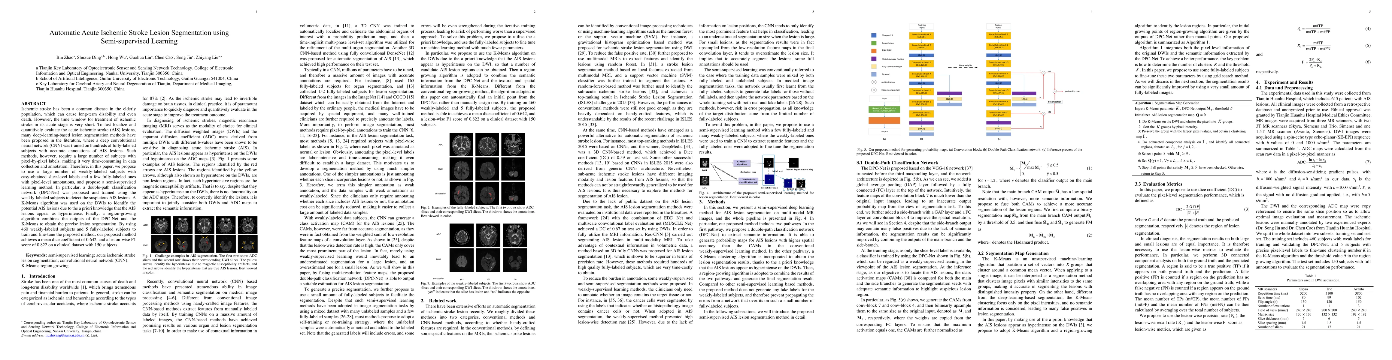 This paper proposes a semi-supervised learning method for automatic segmentation of acute ischemic stroke lesions using diffusion-weighted images and apparent diffusion coefficient maps. The method leverages a large number of weakly labeled subjects and a small number of fully labeled subjects to achieve accurate segmentation, combining a double-path classification network, K-Means clustering, and region-growing algorithms.