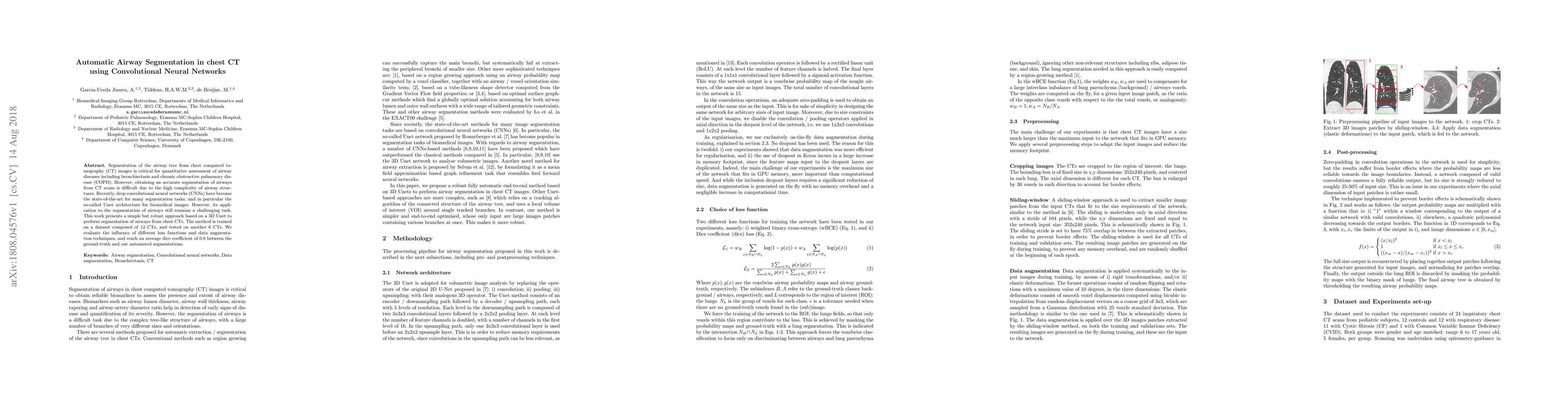 This paper proposes a 3D Unet convolutional neural network for automatic airway segmentation in chest CT scans, achieving an average Dice coefficient of 0.8. The method is evaluated using a dataset of 12 training and 6 testing CT scans, with optimization through various loss functions and data augmentation techniques.
